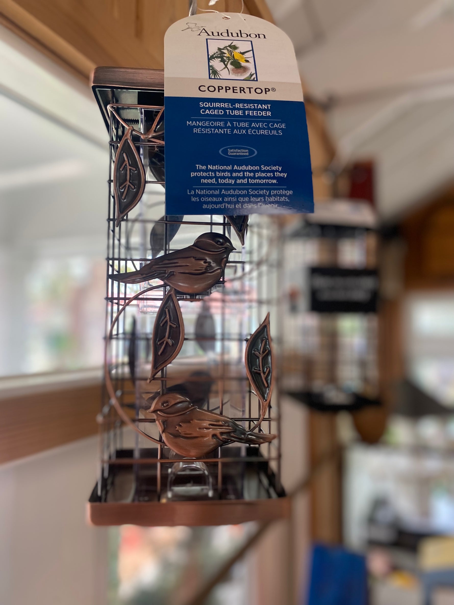 This is the Audubon Coppertop Squirrel-Resistant Caged Tube Feeder, designed to offer a beautiful and durable way to feed your feathered friends while keeping pesky squirrels at bay. Featuring a metal cage with decorative bronze-tone birds and leaves, this feeder protects the inner tube, allowing smaller birds easy access while deterring large intruders.