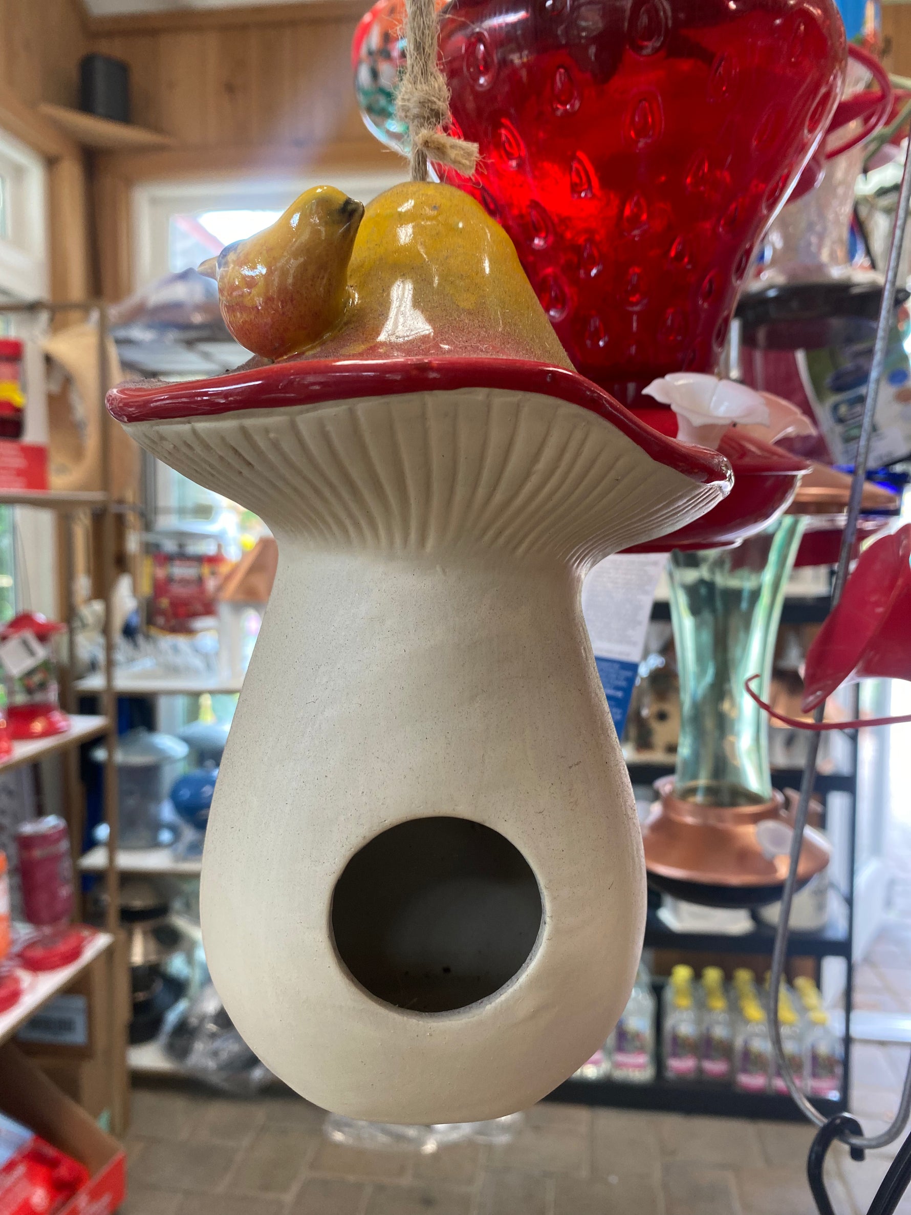 Add a splash of color and charm to your garden with this playful ceramic birdhouse, shaped like a mushroom and topped with a sculpted pear and bird duo in vibrant glazes. A wide overhanging lip adds extra character and shade for nesting birds, while the sturdy rope hanger makes it easy to display on a hook or tree branch.
