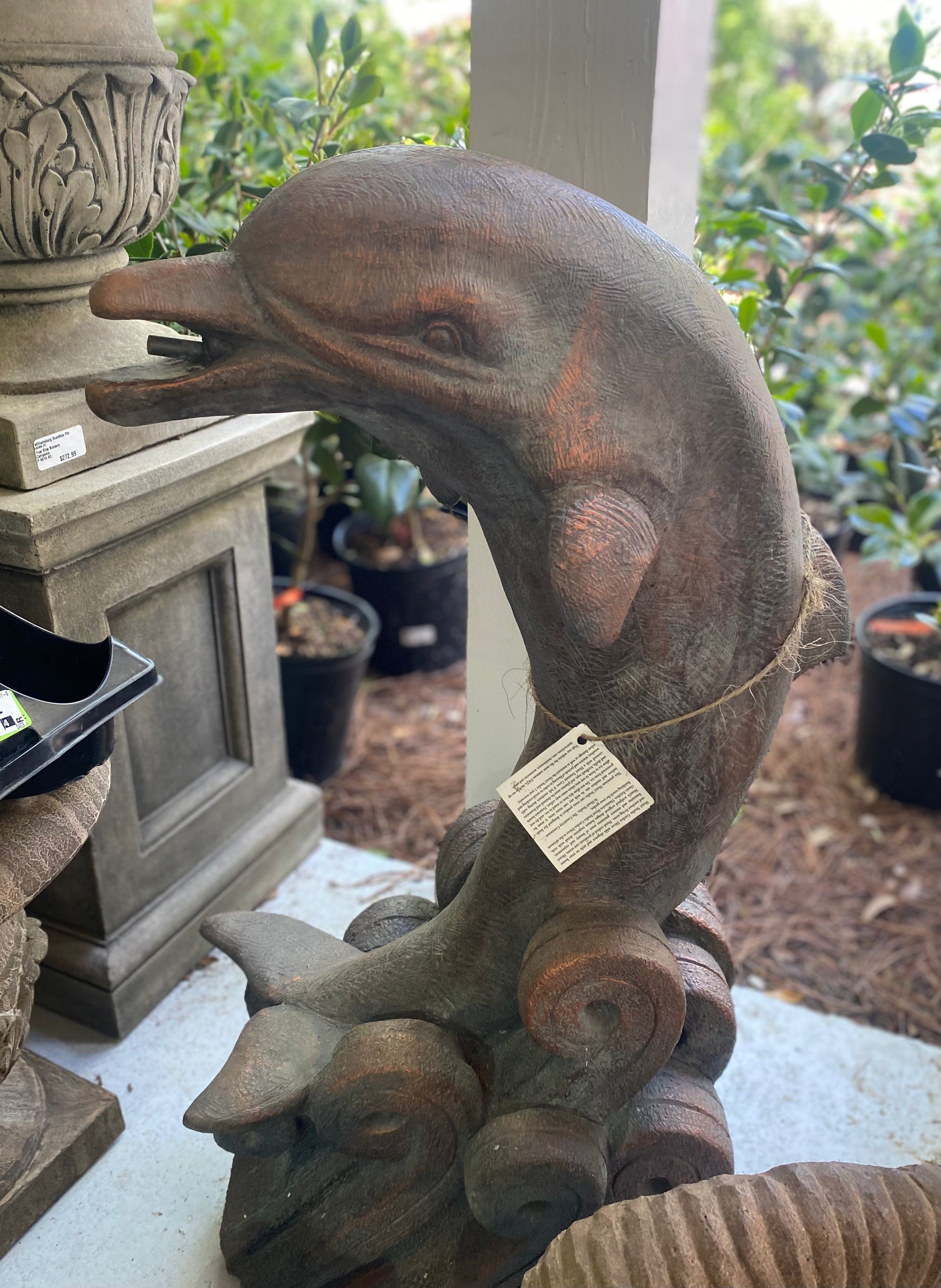 This elegant dolphin statue rises from swirling waves, beautifully sculpted to evoke movement and grace. Cast in weather-resistant stone composite with a rich, aged bronze finish, it adds a coastal charm to gardens, patios, or poolside areas. Its timeless design and flowing form make it a standout accent for ocean lovers and nautical themes alike.