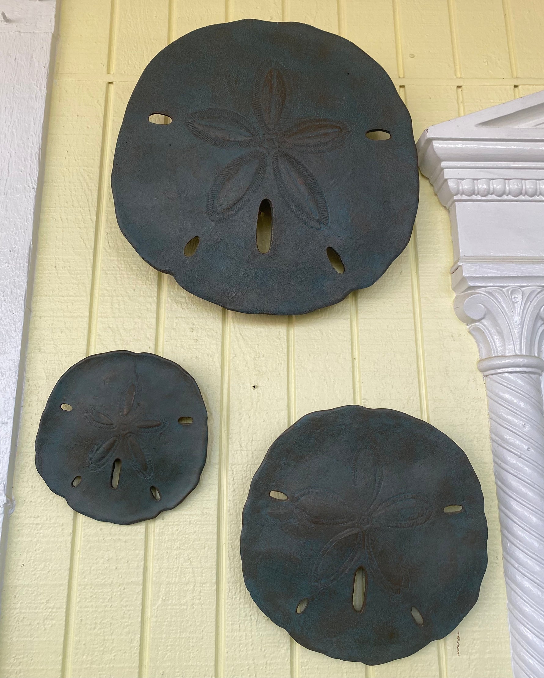 Bring the calming charm of the coast to your home or garden with this set of three sand dollar wall plaques. Crafted from heavy, weather-resistant metal with a rich bronze patina, each piece captures the delicate details of real sand dollars in beautifully aged style. Perfect for coastal-themed patios, porches, or indoor beach decor, these pieces can be displayed together or separately for a custom seaside touch. Suitable for indoor or outdoor use.
