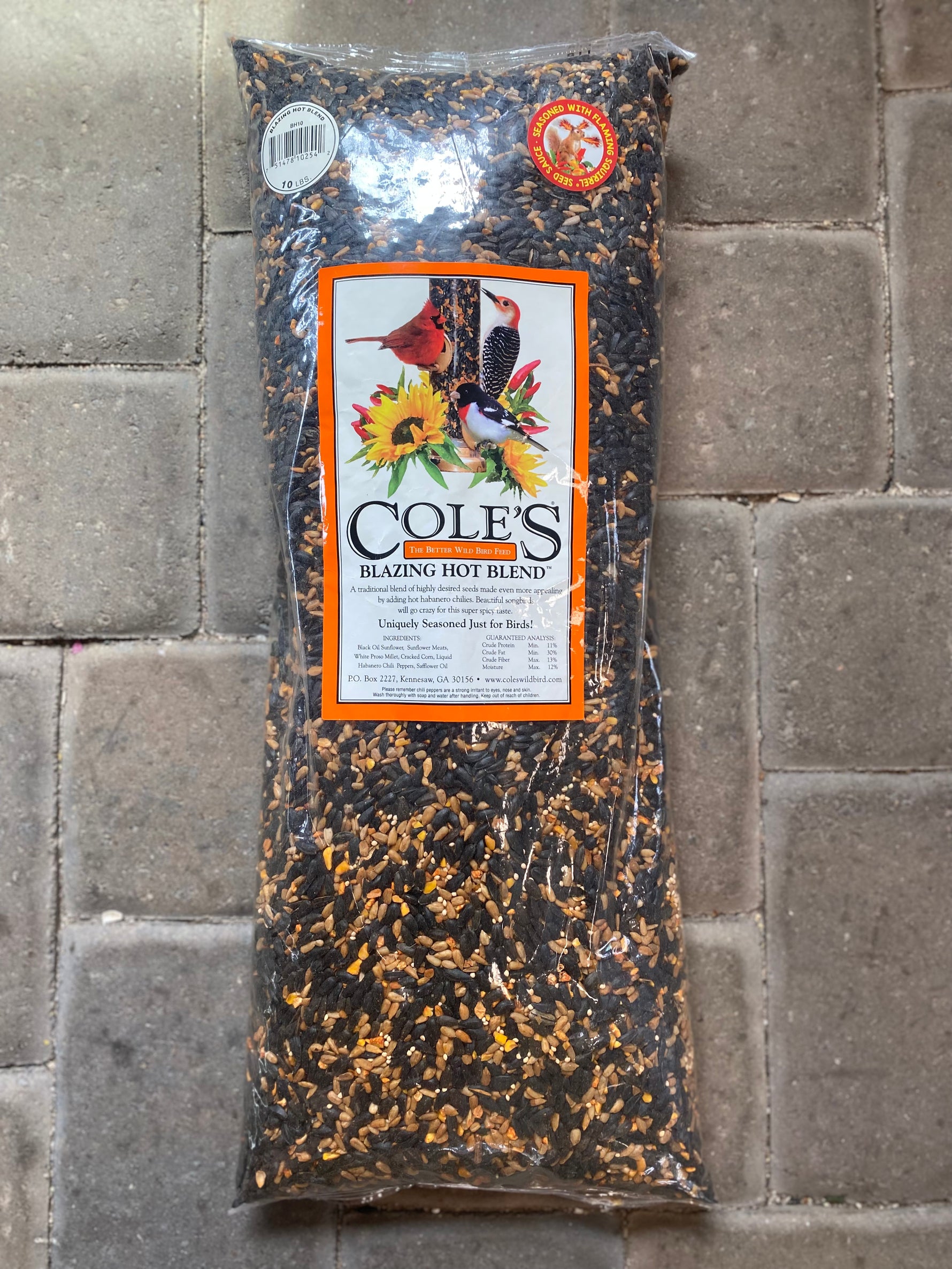 Cole's Blazing Hot Blend is a premium wild bird seed mix uniquely seasoned with all-natural habanero chili peppers to attract beautiful songbirds while deterring pesky squirrels. This fiery blend features high-energy seeds like black oil sunflower, sunflower meats, cracked corn, and more, ensuring birds flock to your feeders without unwanted visitors stealing the feast.