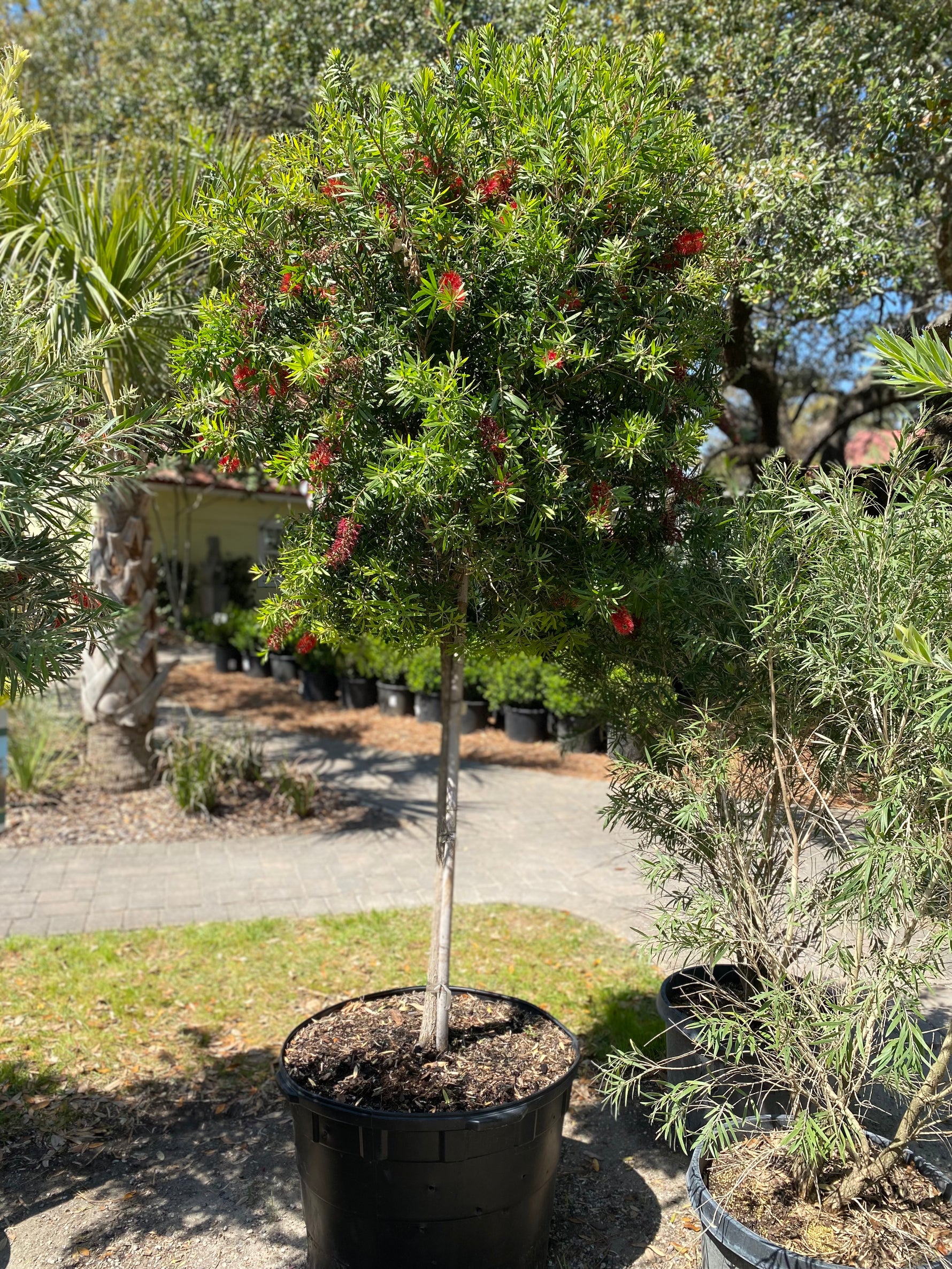 The Crimson Bottlebrush Tree is a vibrant, fast growing ornamental tree known for its brilliant red, Brush-like flower spikes that bloom from spring through fall. These showy blooms attract hummingbirds, butterflies, and bees, making it a top pick for pollinator gardens and tropical style landscapes.