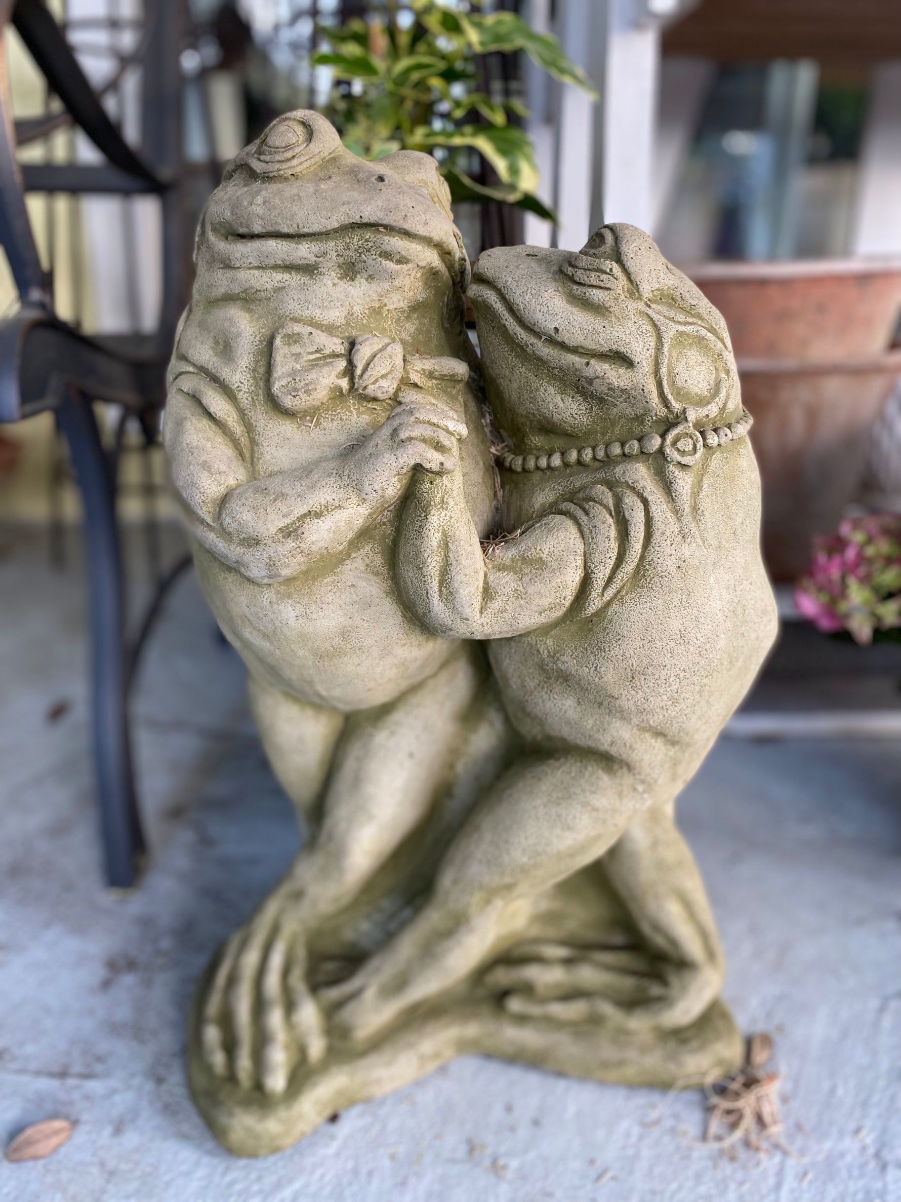 Add whimsical charm to your garden or patio with this beautifully detailed Dancing Frog Couple Statue. Crafted from heavy, high quality cast stone, this durable and weather-resistant piece features an elegantly dressed frog couple mid-dance - complete with a bow tie and pearl necklace.