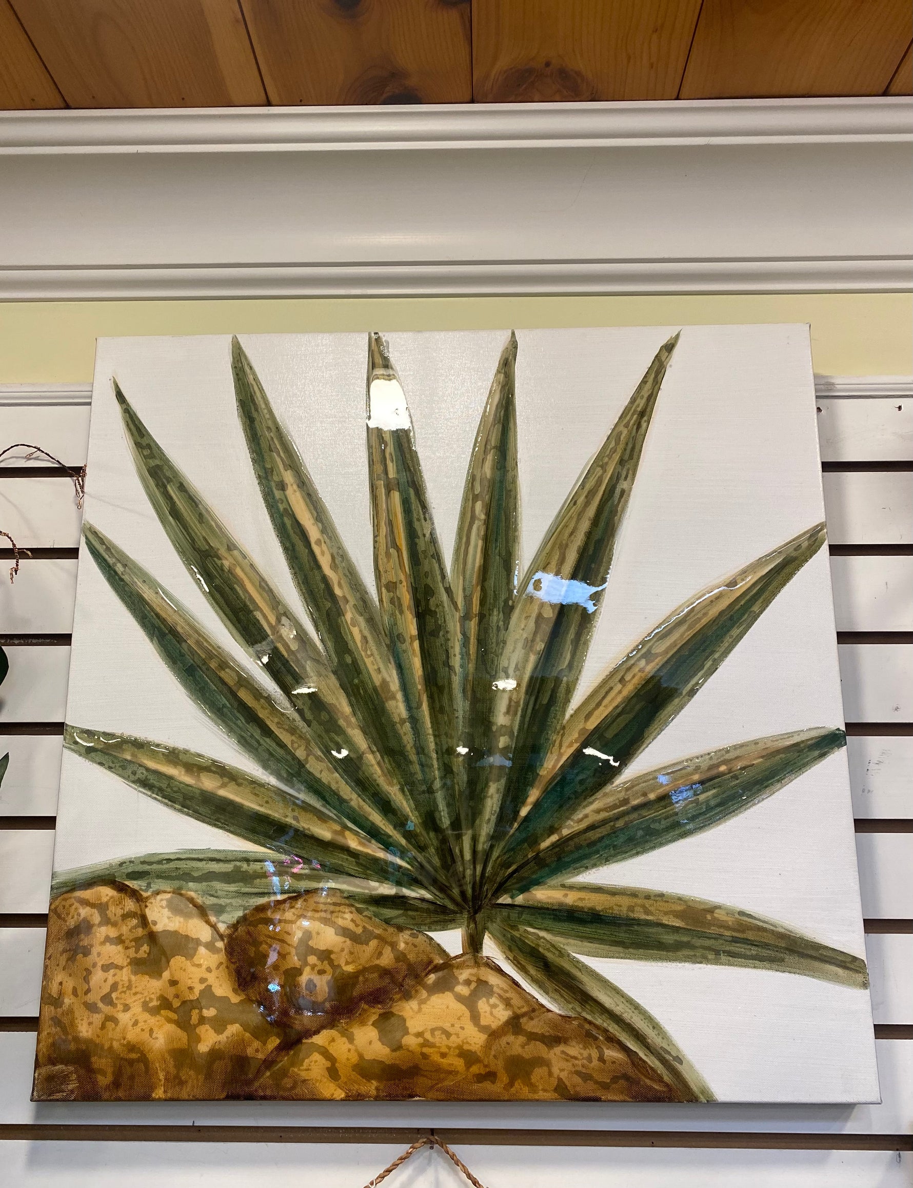 Bring a touch of the Southwest into your space with this Desert Agave Wall Art, featuring a vibrant hand-painted depiction of a green agave plant rising from golden desert rocks. The textured brushstrokes and glossy finish give this piece depth, color, and natural energy, perfect for brightening up any room. Perfect for Southwestern, botanical, tropical, or nature-inspired decor.