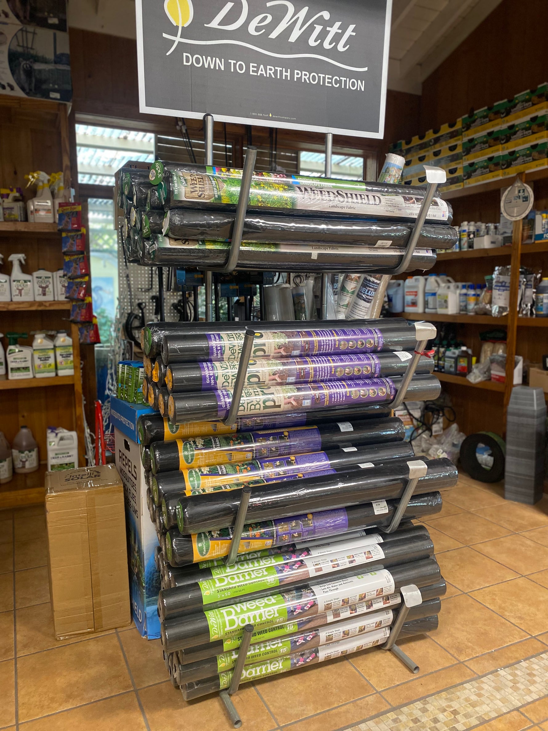This well-stocked display features a wide selection of DeWitt professional grade landscape fabrics - ideal for gardeners, landscapers, and DIY homeowners looking for dependable weed control and soil protection.