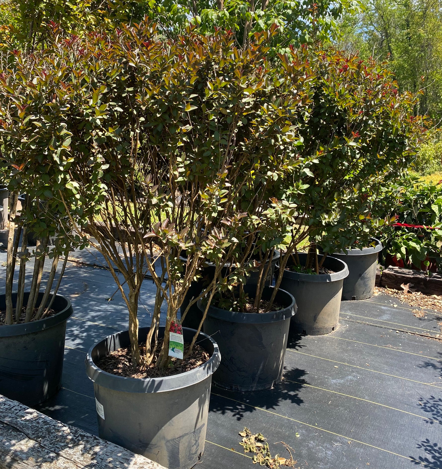 The Double Feature Crape Myrtle is a compact, reblooming variety that lives up to its name by delivering two standout features: rich cherry-red blooms and deep wine-colored new foliage that holds its color beautifully. Unlike standard crape myrtles, this variety stays small, bushy, and blooms without the need for deadheading.