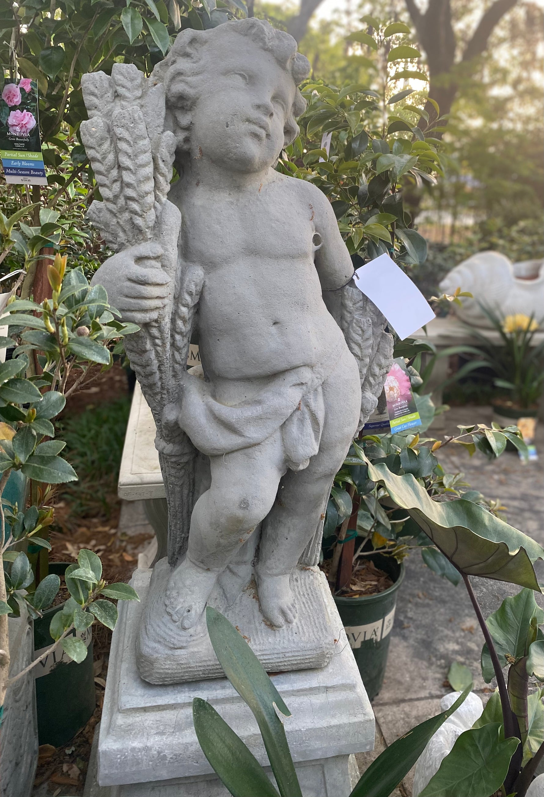 Add ttimeless charm to your garden with this handcrafted Fall Genoa Season statue, sculpted from premium cast stone. Standing with classical grace and rich detail, this 200lb piece features a serene cherubic figure holding a bundle of wheat, symbolizing abundance and harvest. Durable enough to withstand the elements, it's ideal as a focal pint in gardens, courtyards, or entranceways. A true heirloom-quality piece that brings elegance to any outdoor space.