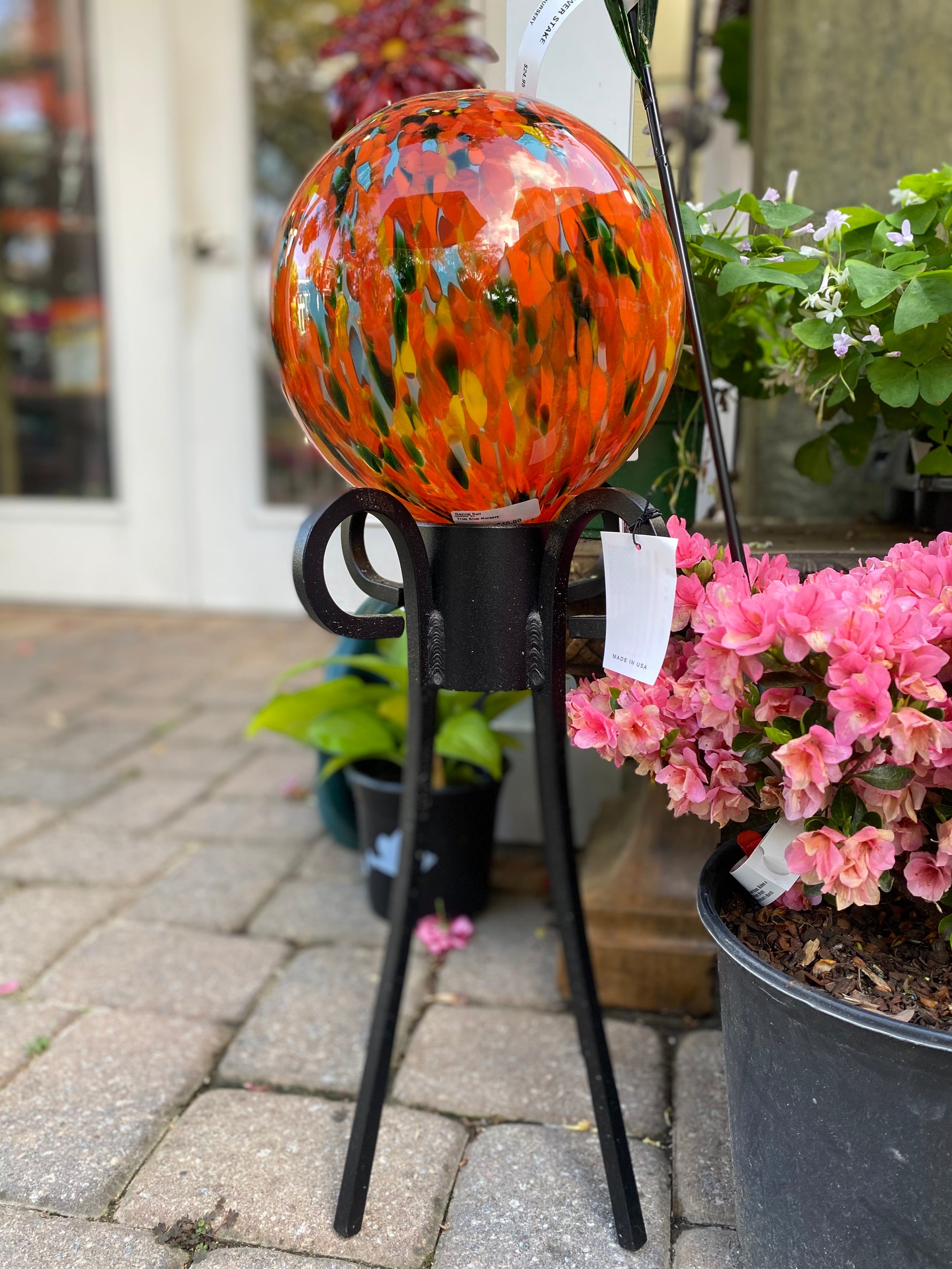 Bring bold color and striking contrast to your outdoor space with this fiery orange speckled gazing ball. on a sleek black iron stand. The hand-blown glass speher features vibrant swirls of orange, red, and black with touches of yellow and blue, catching the sunlight with dazzling effect. Paired with a sturdy wrought iron stand with decorative curls, it makes a dramatic statement in any garden or patio setting.