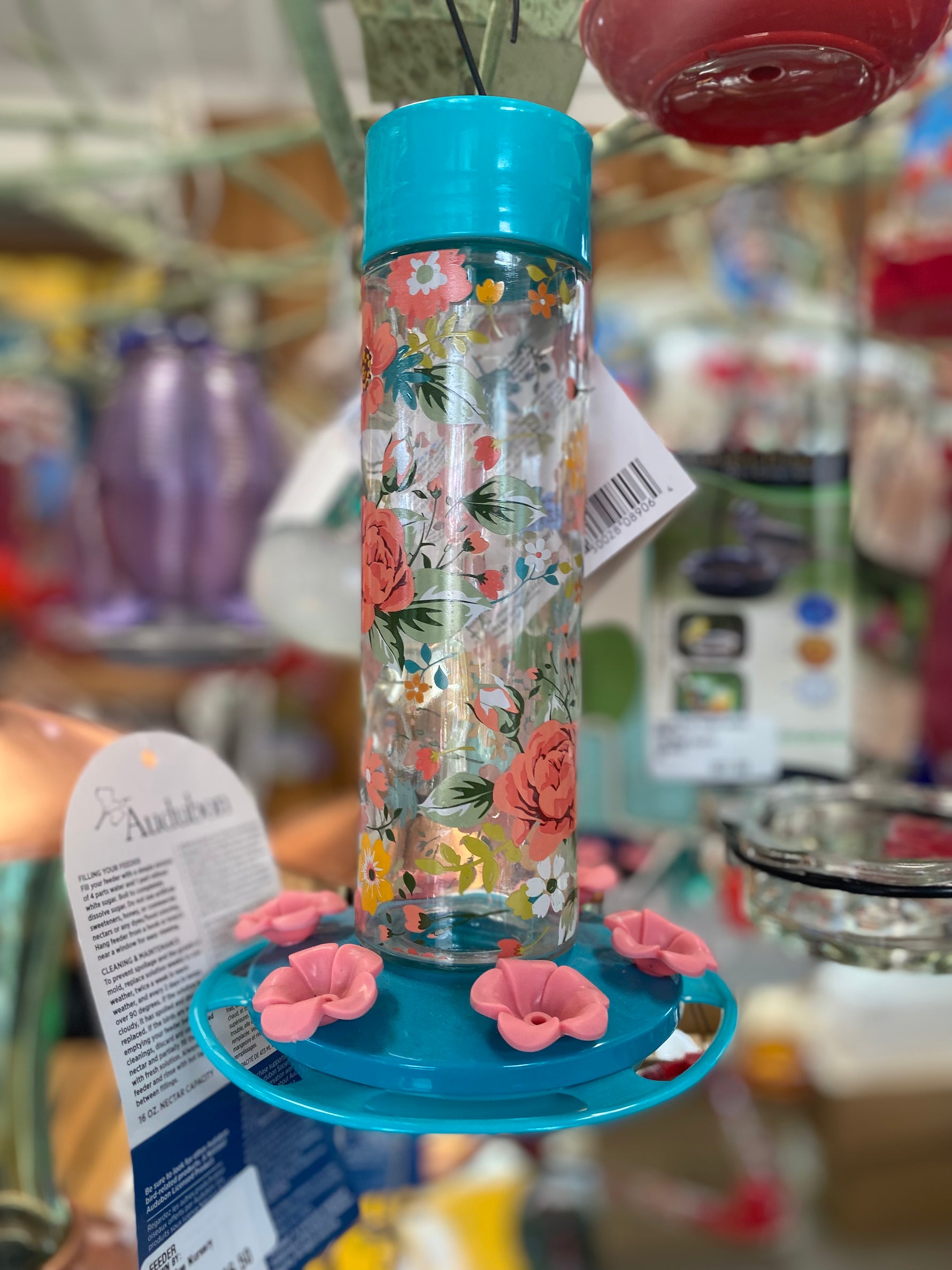 Brighten your garden with this cheerful floral hummingbird feeder, featuring a clear glass body wrapped in a vibrant pink and orange flower print. The turquoise top and base offer a fresh pop of color, while six soft pink flower shaped feeding ports invite hummingbirds in for a sweet sip. Durable and eye-catching, this feeder is both functional and decorative, perfect for adding a playful, charming vibe to your outdoor space.