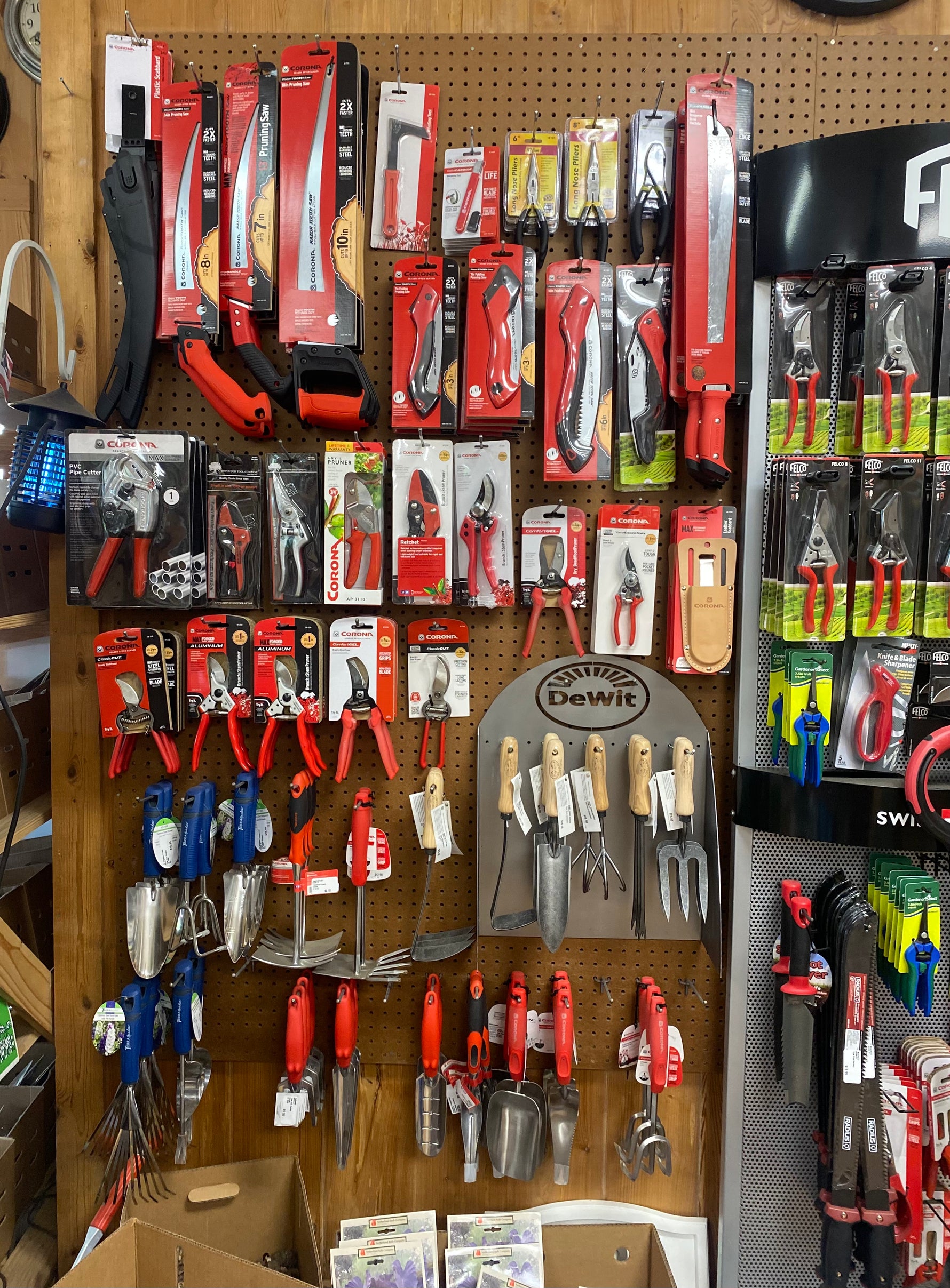 This well-stocked display features high-quality hand tools from trusted brands like Corona, Felco, and DeWit, perfect for home gardeners and professionals alike: