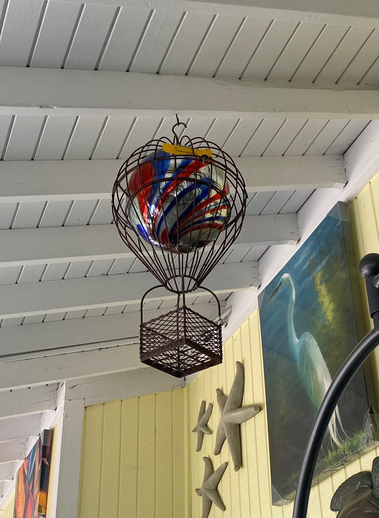 Take your garden or porch decor to whimsical new heights with this handcrafted hanging hot air balloon accent. Featuring a hand-blown, multicolored glass globe encased in a rustic iron frame with a detailed wire basket, this eye-catching piece adds charm and imagination to any outdoor space. Perfect for hanging from a porch beam, pergola, or tree branch. A playful tribute to adventure and artistry.