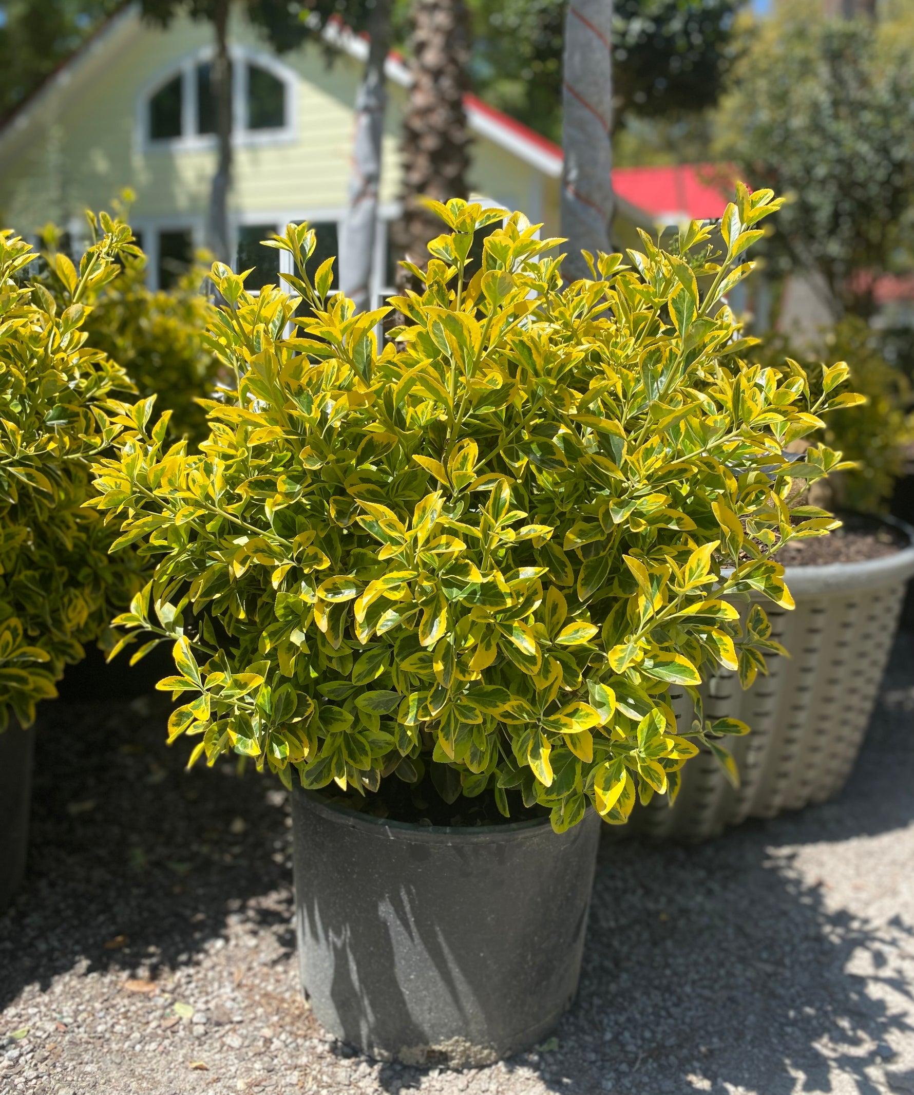 Golden Euonymus is a vibrant, evergreen shrub prized for its bold foliage. Its glossy green leaves are edged with bright golden-yellow margins, offering year round color and striking contrast in the landscape. This easy-care plant is versatile - ideal for hedges, foundation plantings, or as an accent in containers or garden beds. Its tolerates a variety of soils, thrives in full sun to partial shade, and can be pruned to shape. Deer resistant and drought tolerant once established, Golden Euonymus is a standout choice for low-maintenance color and structure.