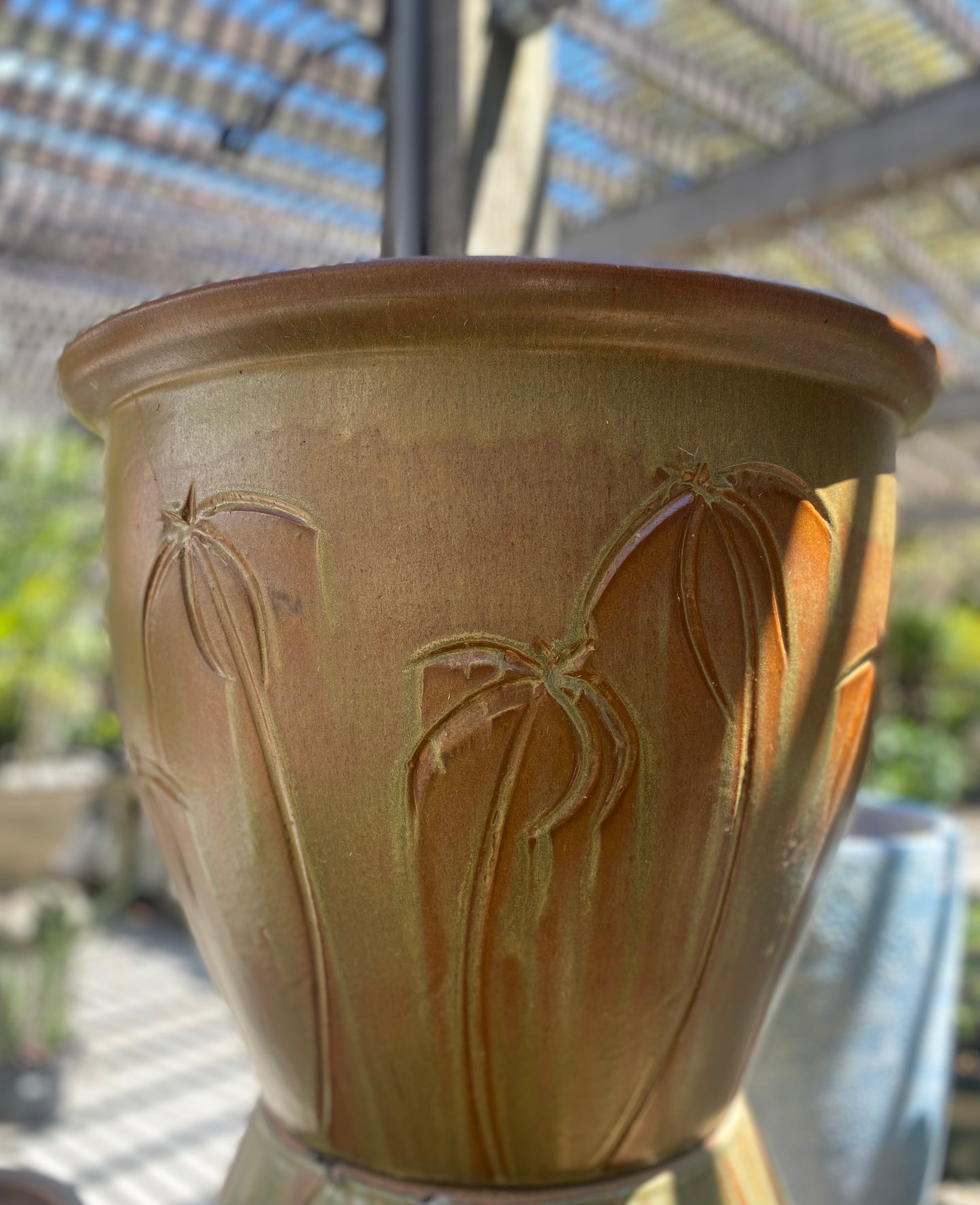 This warm-toned stone planter features a subtle golden glaze and a graceful raised palm design that adds tropical charm and texture. With its earthy finish and elegant silhouette, it's a beautiful choice for accenting patios, lanais, or poolside gardens. Durable and weighty enough for outdoor use, yet refined enough for entryways or sunrooms.