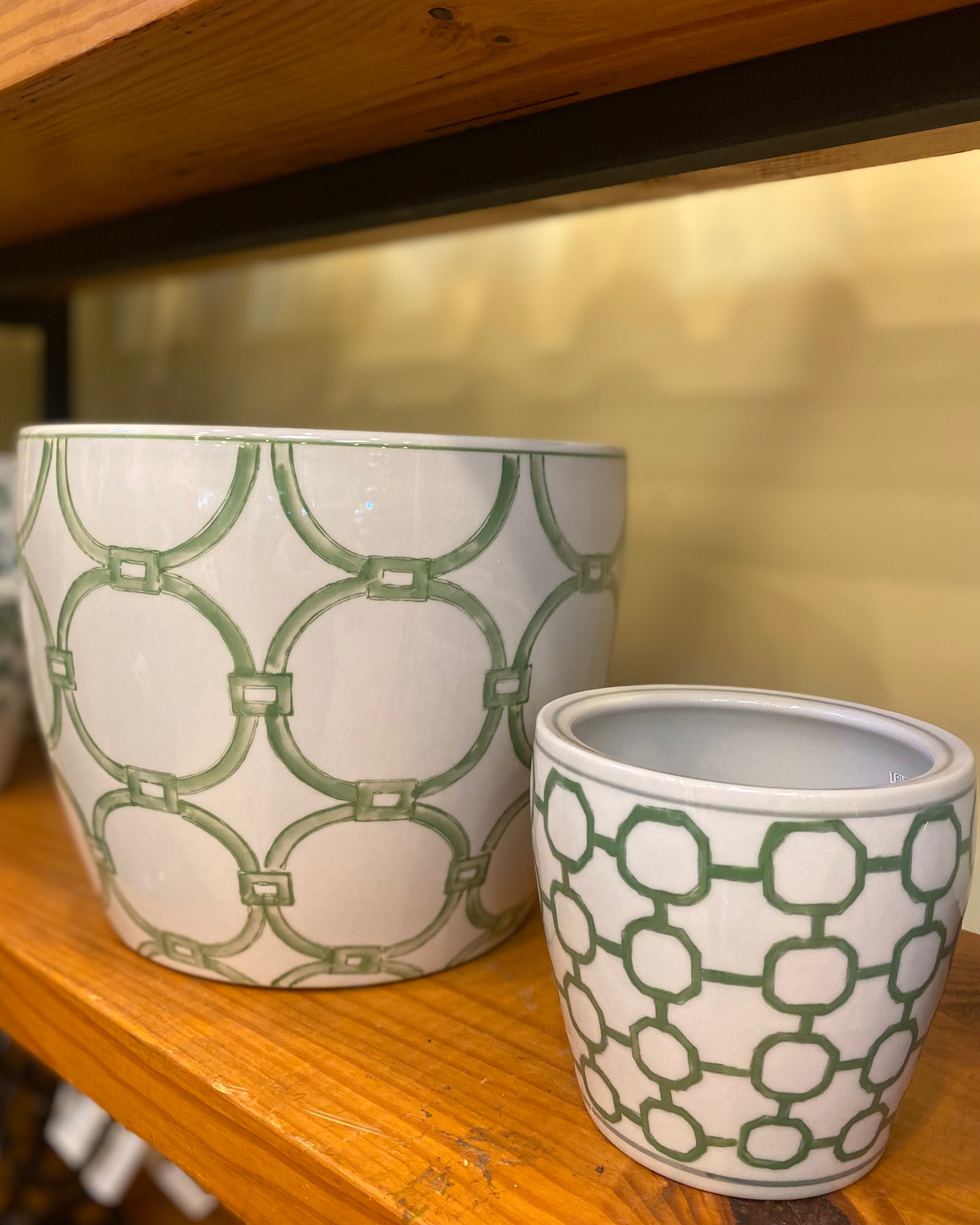 Chic and contemporary, these ceramic planters feature stylish green lattice patterns against a crisp white background. Their clean, geometric designs add a fresh, modern touch to your indoor plants, herbs, or decorative displays. A beautiful blend of classic and current styles.