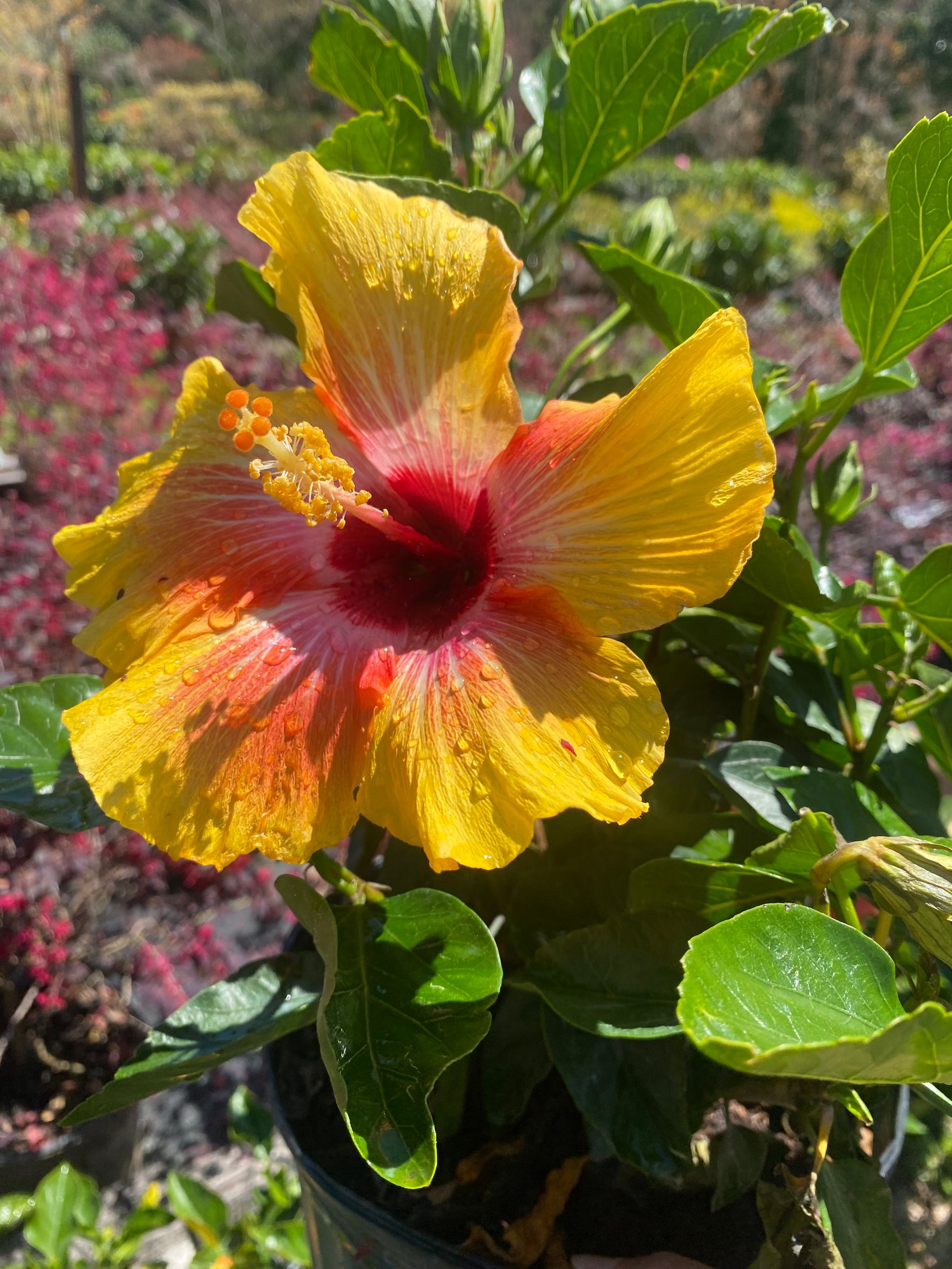 Bring a burst of color to your garden or patio with the vibrant blooms of Hibiscus 'Fiesta' - a tropical beauty with golden-yellow flowers and a rich red or orange eye. This compact, sun loving shrub adds instant warmth and island flair to landscapes, borders, and containers.