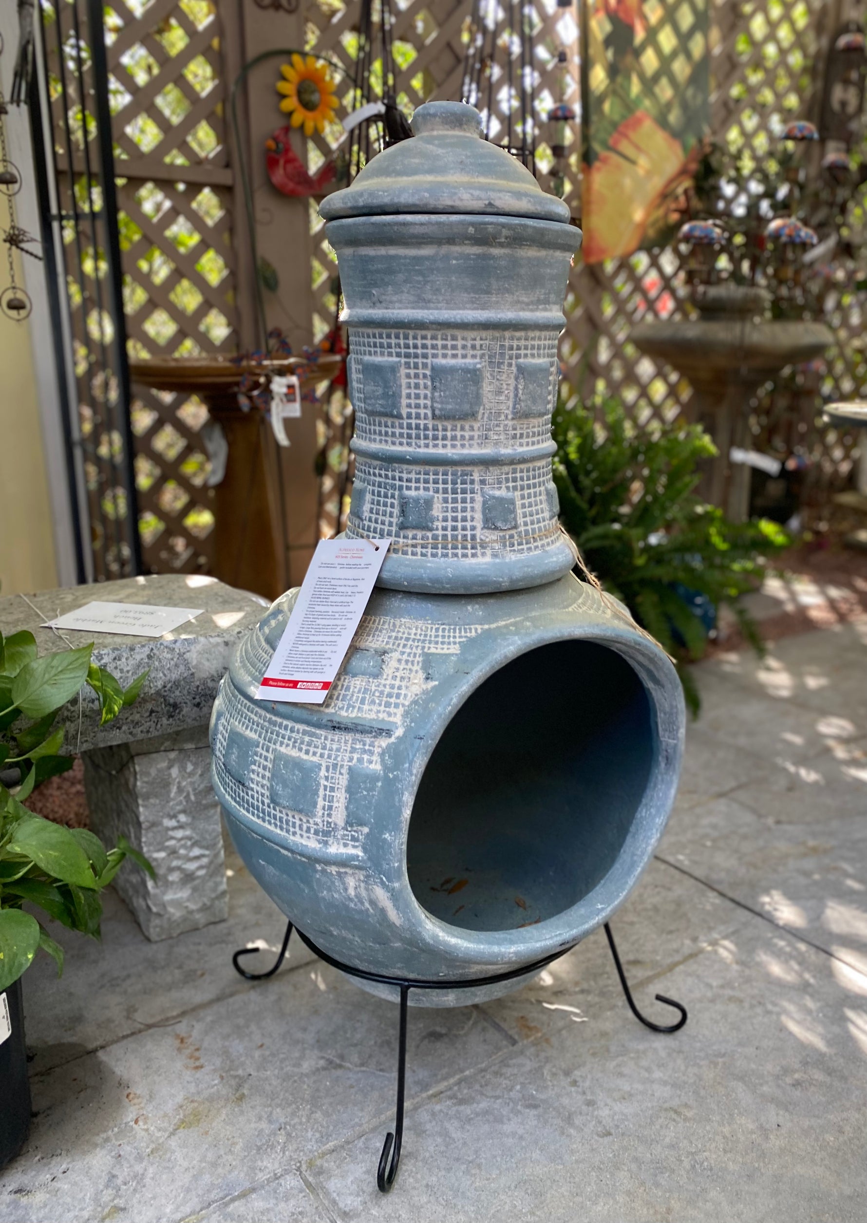 Elevate your outdoor ambiance with the Large Chiminea Squares by Alfresco Home. Handcrafted in Mexico from natural clay, this rustic chiminea features a distinctive geometric square pattern in a soft weathered blue finish, adding warmth and character to any patio or garden space. Designed for small wood fires, this chiminea radiates heat efficiently and safely with proper care.