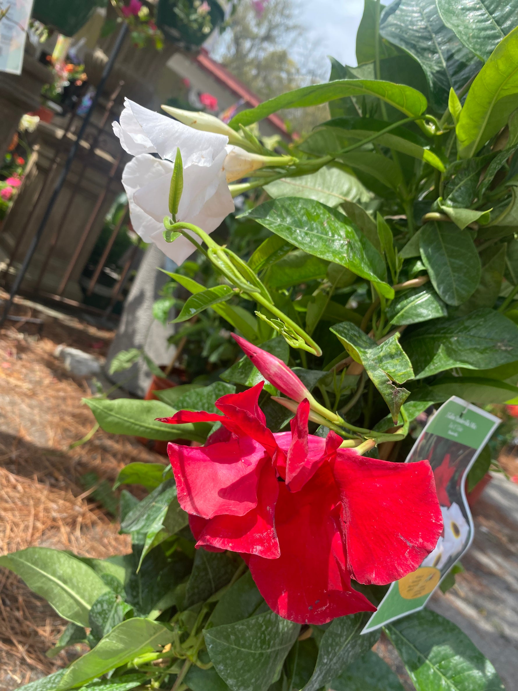 Make a bold statement with this Red & White Mandevilla mix, trained on a trellis for instant vertical impact. With dazzling, trumpet shaped blossoms in two stunning shades - rich red and crisp white - this tropical vine creates a lush, eye-catching display all season long. The glossy green foliage provides the perfect backdrop for continuous color from late spring through fall.