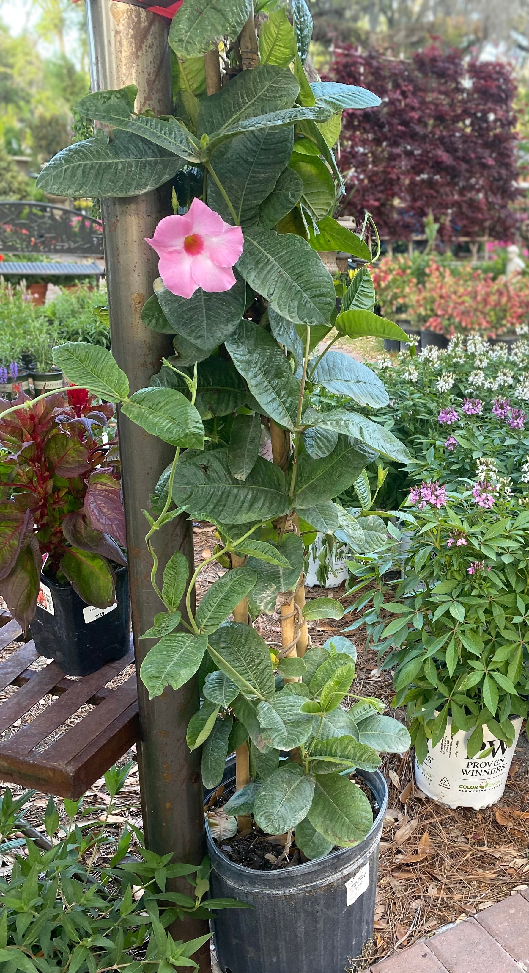 Bring a tropical flair to your garden with the Pink Madevilla on trellis. This vigorous climber produces a large, trumpet-shaped blooms in a rich, romantic pink that continuously flower through the warm months. Supported by a sturdy trellis, it adds instant vertical interest and color to patios, porches, and landscapes.