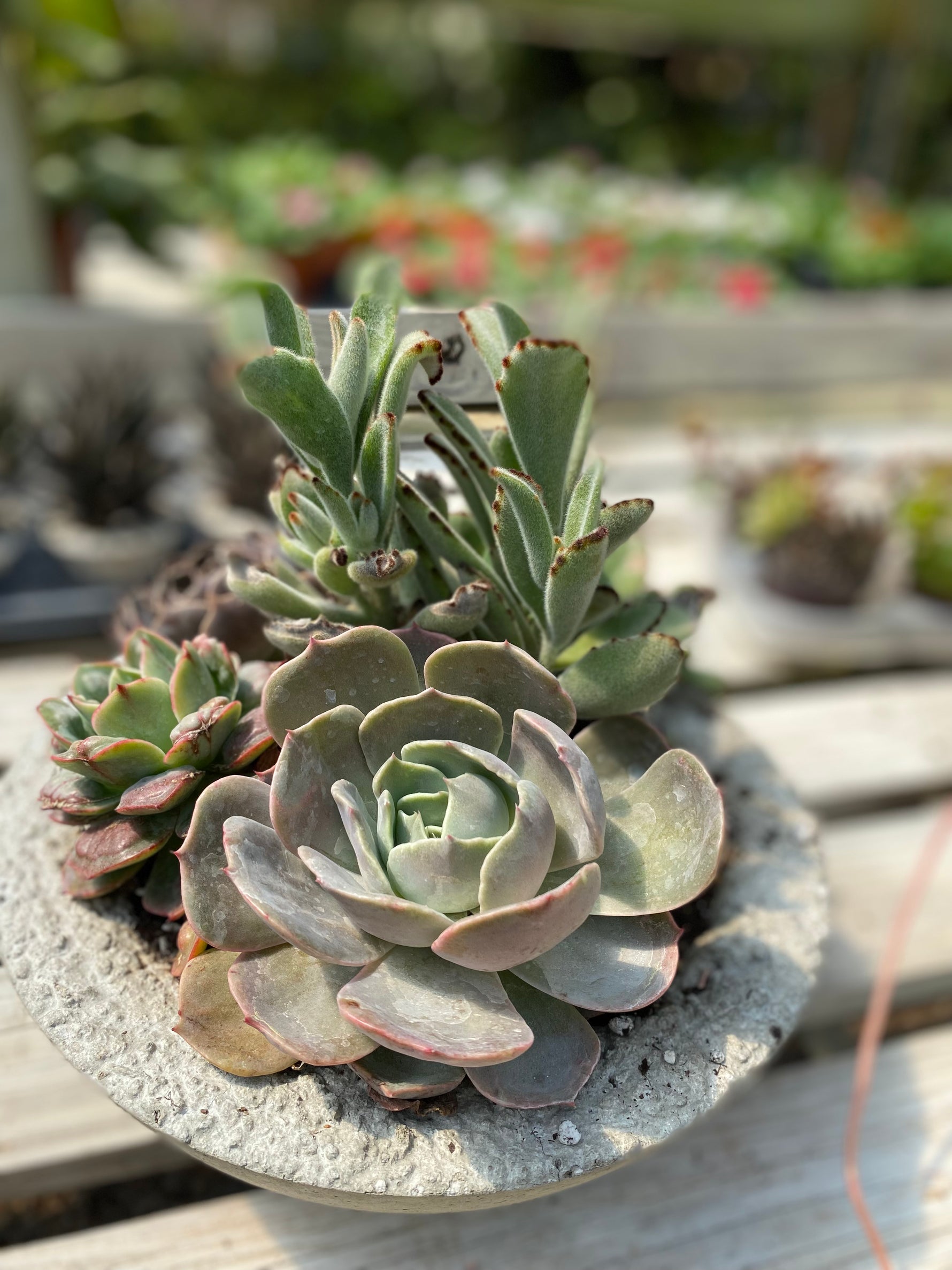 This eye-catching succulent arrangement features a beautiful blend of textures and tones, with soft, fuzzy Chocolate Soldier reaching upward and smooth Echeveria rosettes blooming out below in dusty greens and pinks. Planted in a rustic stone-style bowl, this combo is perfect for sunny windows, patios, and tabletops.