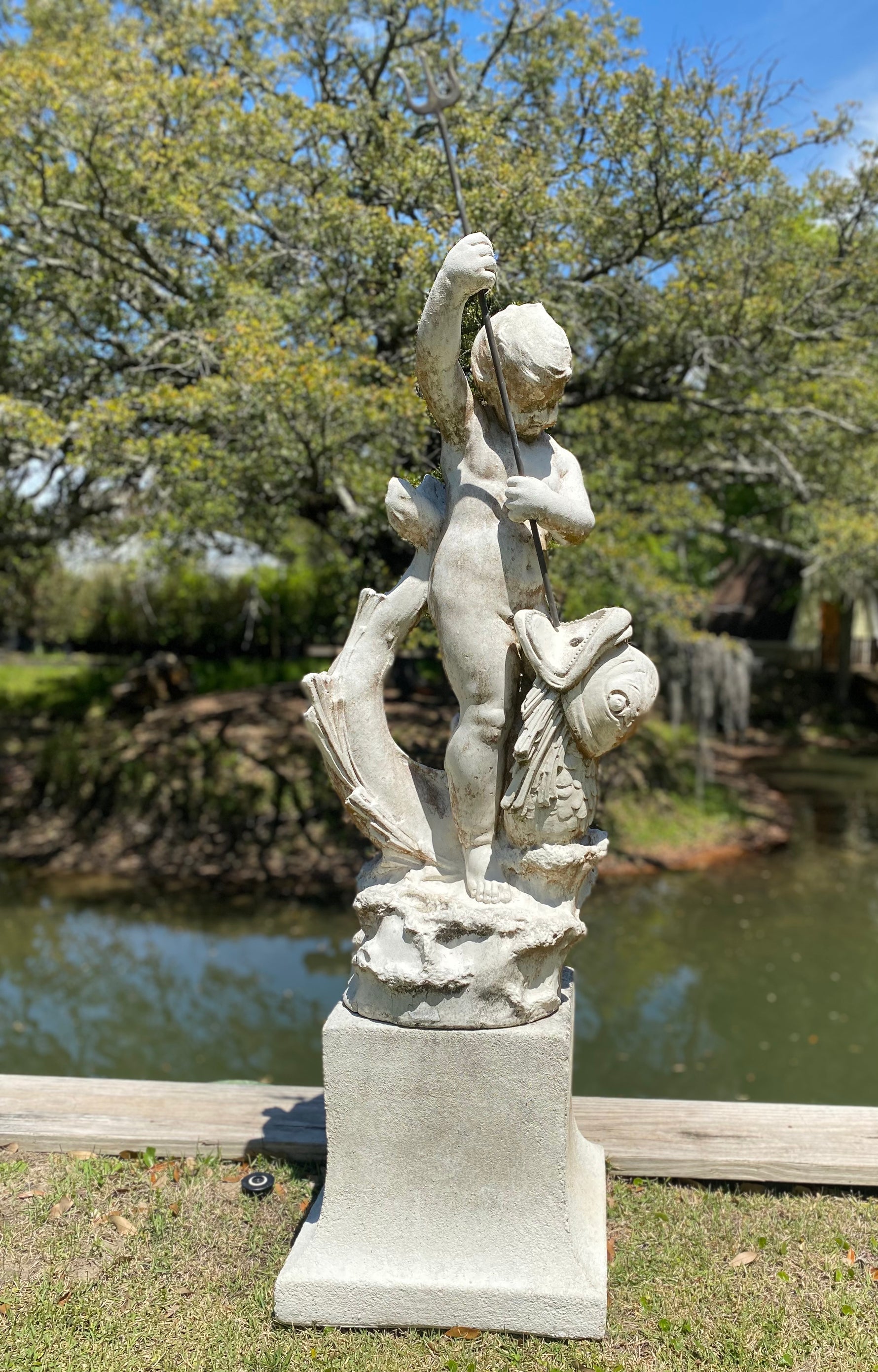 This captivating stone sculpture features a cherub-like figure wielding a trident, stranding triumphantly alongside a detailed fish, evoking mythological symbolism reminiscent of Neptune. The statue's classical form and aged finish give it timeless character, making it a striking centerpiece in any garden or water-side setting.