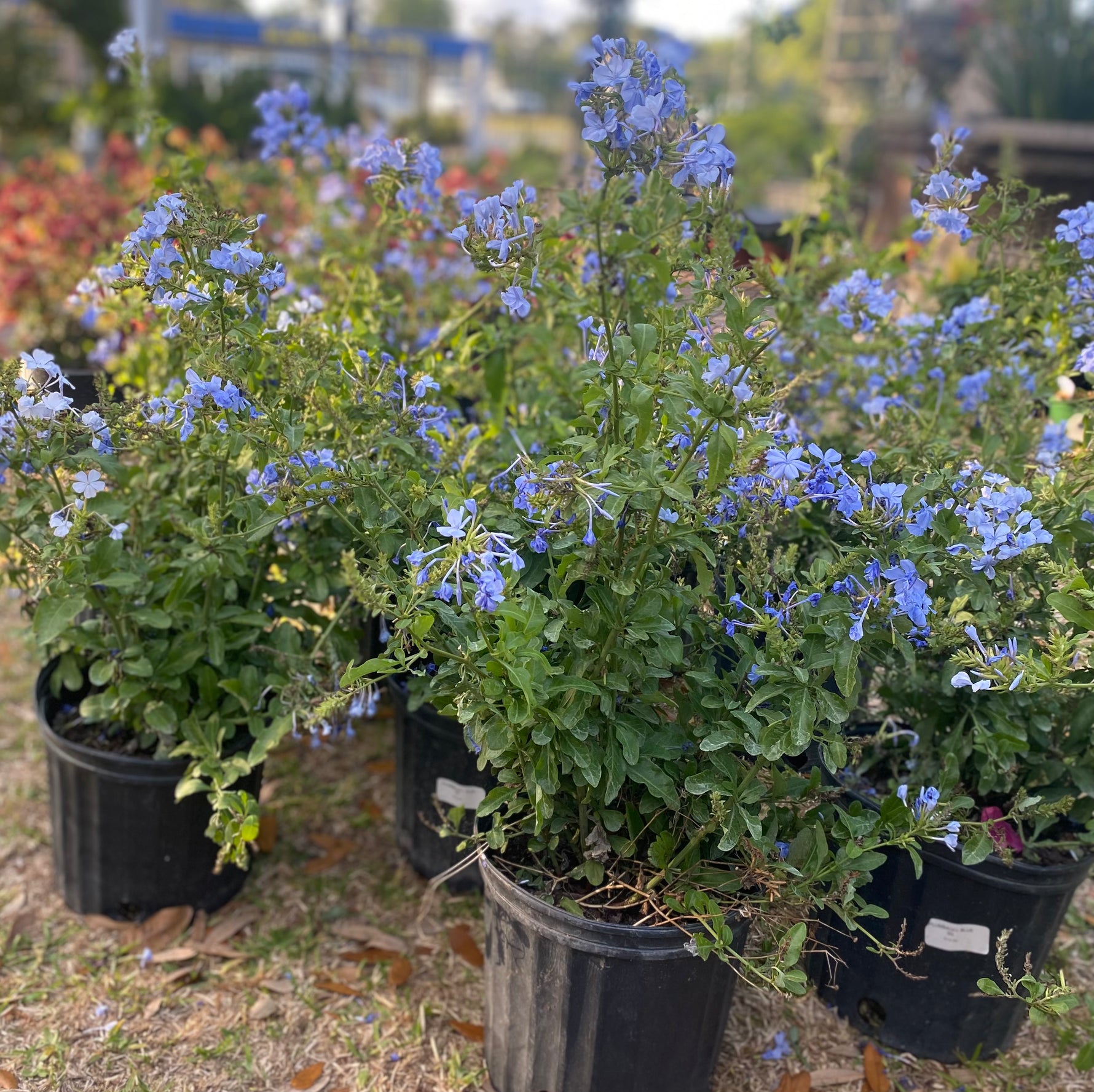 Plumbago is a beautiful, sprawling flowering shrub known for its masses of sky-blue blooms that appear continuously from spring through fall. With its soft, mounding habit and light green foliage, Plumbago adds a lush, airy feel to gardens, patios, and containers. It thrives in full sun and warm temperatures, making it ideal for tropical and southern landscapes. Highly attractive to butterflies and low-maintenance once established, Plumbago is perfect for use as a ground cover, border plant, or cascading container accent.
