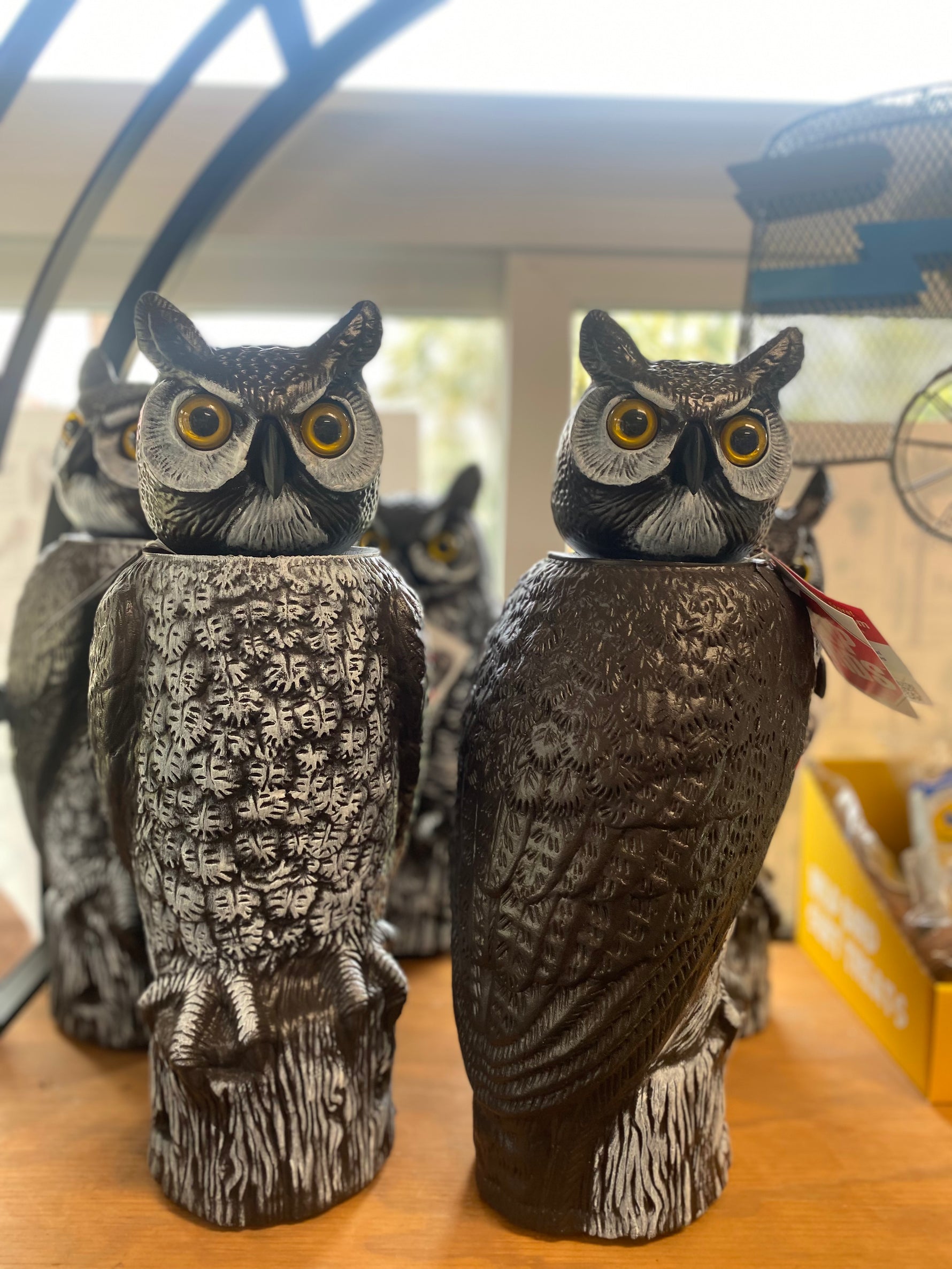 Protect your garden, porch, or dock with this life-like owl decoy, hand painted in Tennessee and made from 99.1% recycled materials. Its wind powered rotating head mimics natural movement to effectively scare away birds and small pests - without using harmful chemicals. Not only does it help prevent roosting on roofs, eaves, and boats, but it also adds a charming touch to any outdoor space. Proudly Made in the USA, this eco-friendly owl is as practical as it is decorative.