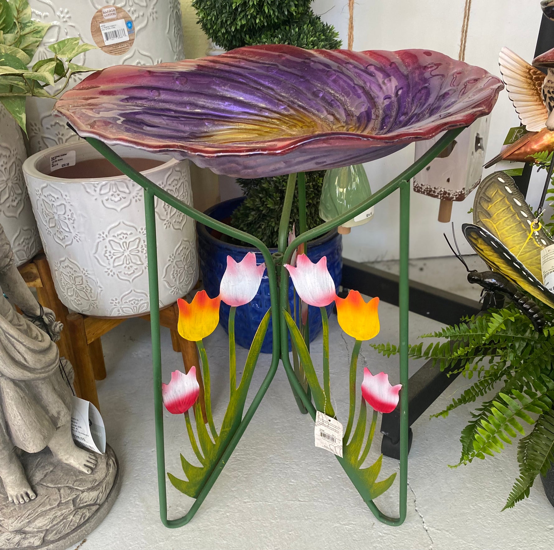 This vibrant 18" birdbath features a hand-painted glass bowl in rich purple and golden hues, mimicking the graceful curve of a flower petal. The colorful metal stand showcases blooming tulips, adding a whimsical pop of color and charm to any garden space. Handcrafted by talented artisans, this piece is both decorative and functional - perfect for attracting birds while brightening up your patio or landscape. Suitable for indoor or outdoor display.