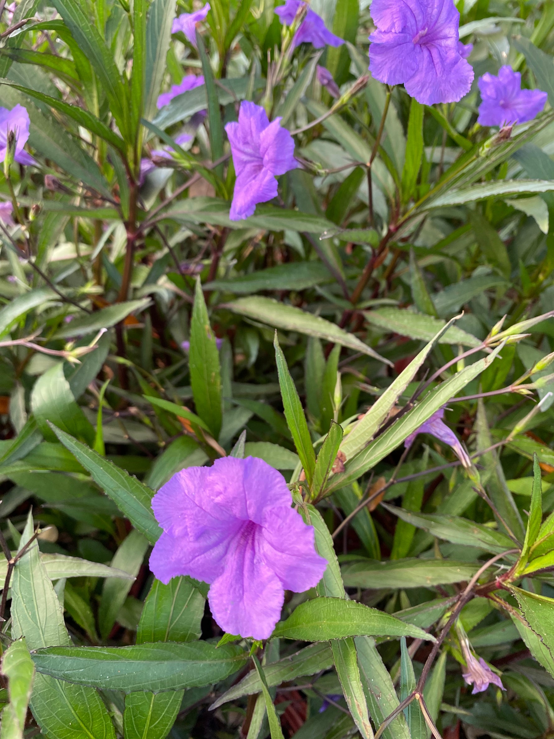 Ruellia 'Purple Showers', also known as Mexican Petunia, is a vigorous, heat-loving perennial that brings a flood of violet-purple blooms to the garden from spring through fall. This fast-growing plant features tall, upright stems and dark green, lance-shaped leaves, creating a lush, tropical look with minimal effort.