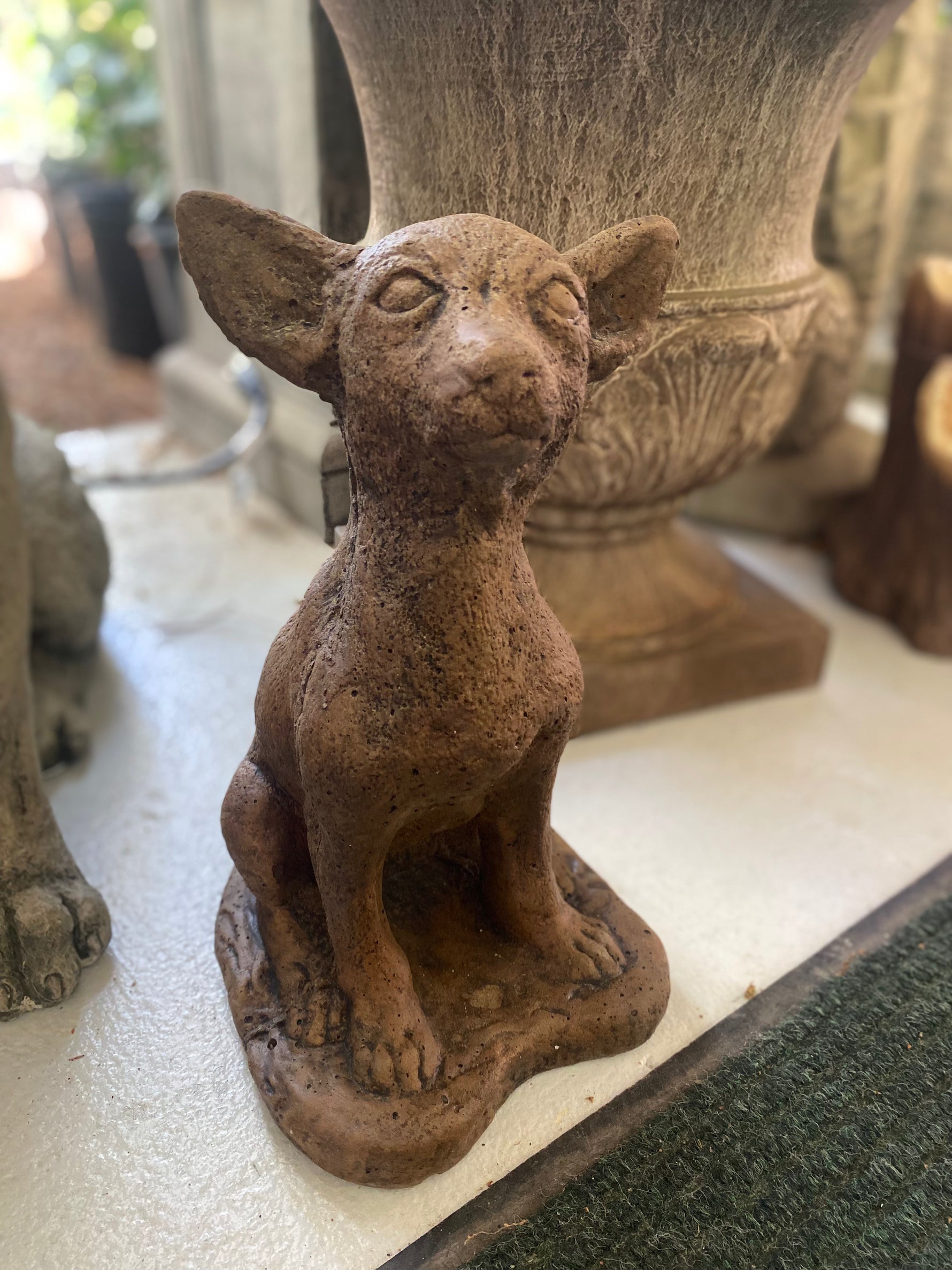 This charming chihuahua statue brings character and whimsy to any garden or patio. Crafted from rustic-toned cast stone, it features oversized ears, a perky posture, and a playful yet stoic expression. Perfect for dog lovers or those wanting a petite yet bold decorative accent.