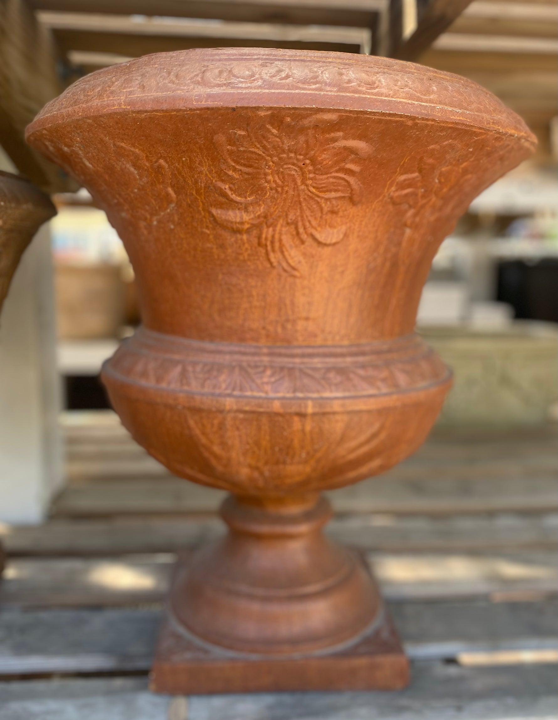 Standing approximately 18" tall, the Rustic Florentine Urn brings old-world charm to any garden, patio, or entryway. With its rich terracotta finish, raised floral detailing, and elegant pedestal base, this planter creates a timeless, formal look.