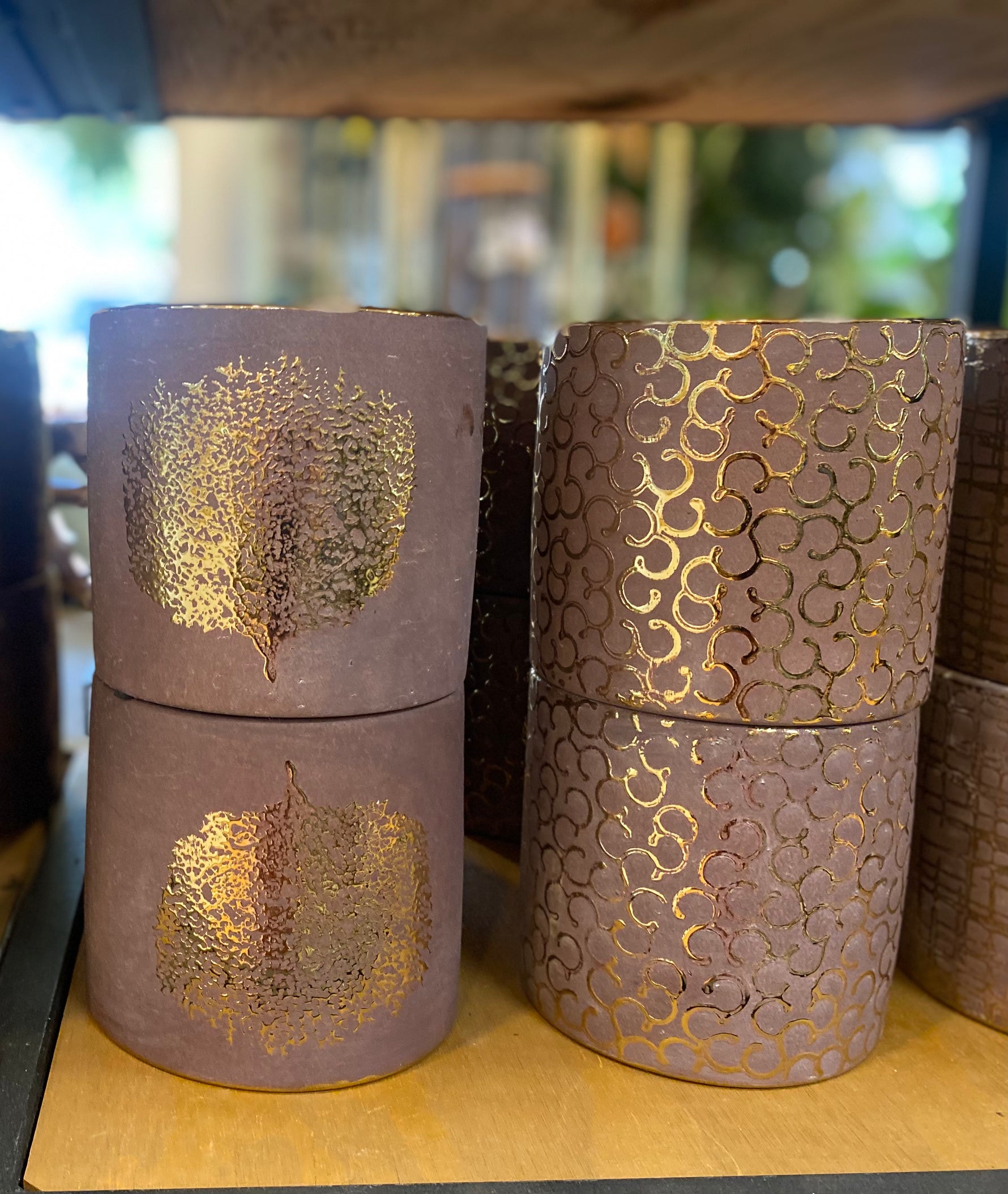 These richly textured planters feature warm, earthy tones with beautiful metallic gold accents - one with an intricate tree design and the other with a flowing abstract pattern. Their rustic charm and artistic details make them a striking choice for showcasing your favorite plants indoors or on a covered patio.
