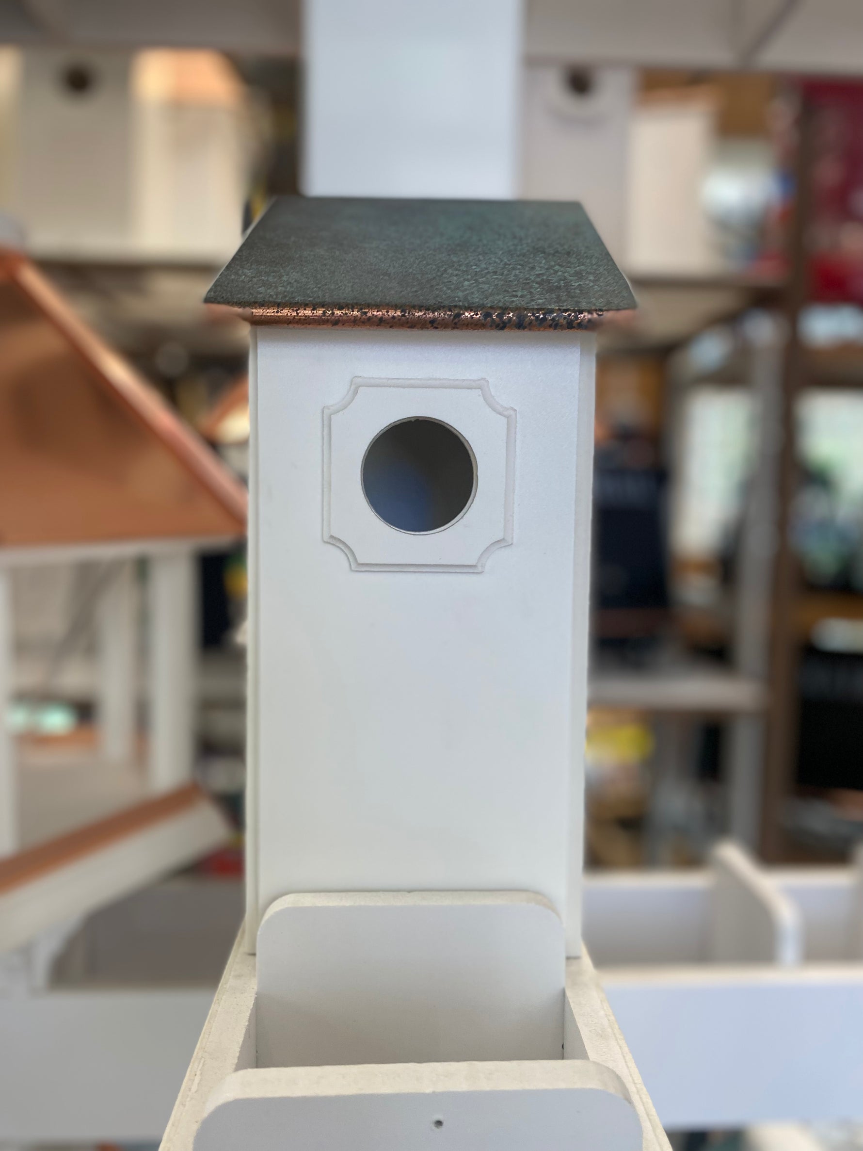 Invite small birds to nest in style with this classic vertical birdhouse, featuring a patina-finished copper roof and smooth, white weatherproof body. With a clean design and a subtle raised frame around the entry hole, it brings both charm and simplicity to your garden, porch post, or fence line.