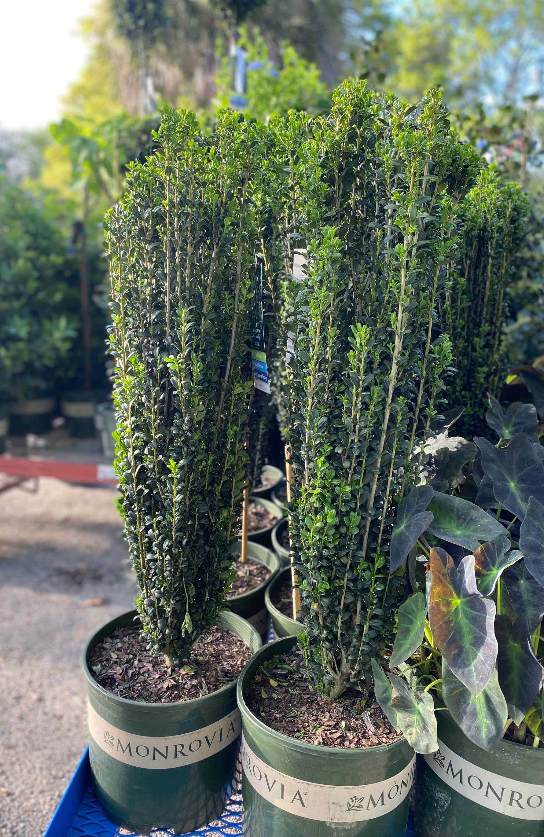 This is a sleek, upright evergreen shrub prized for its narrow columnar shape and glossy, dark green leaves. Growing naturally tall and slender, it's the perfect choice or tight spaces, formal gardens, entryways, or container plantings where vertical interest is needed. Unlike traditional hollies, Sky Pencil has soft, spineless foliage and a tidy, modern look.