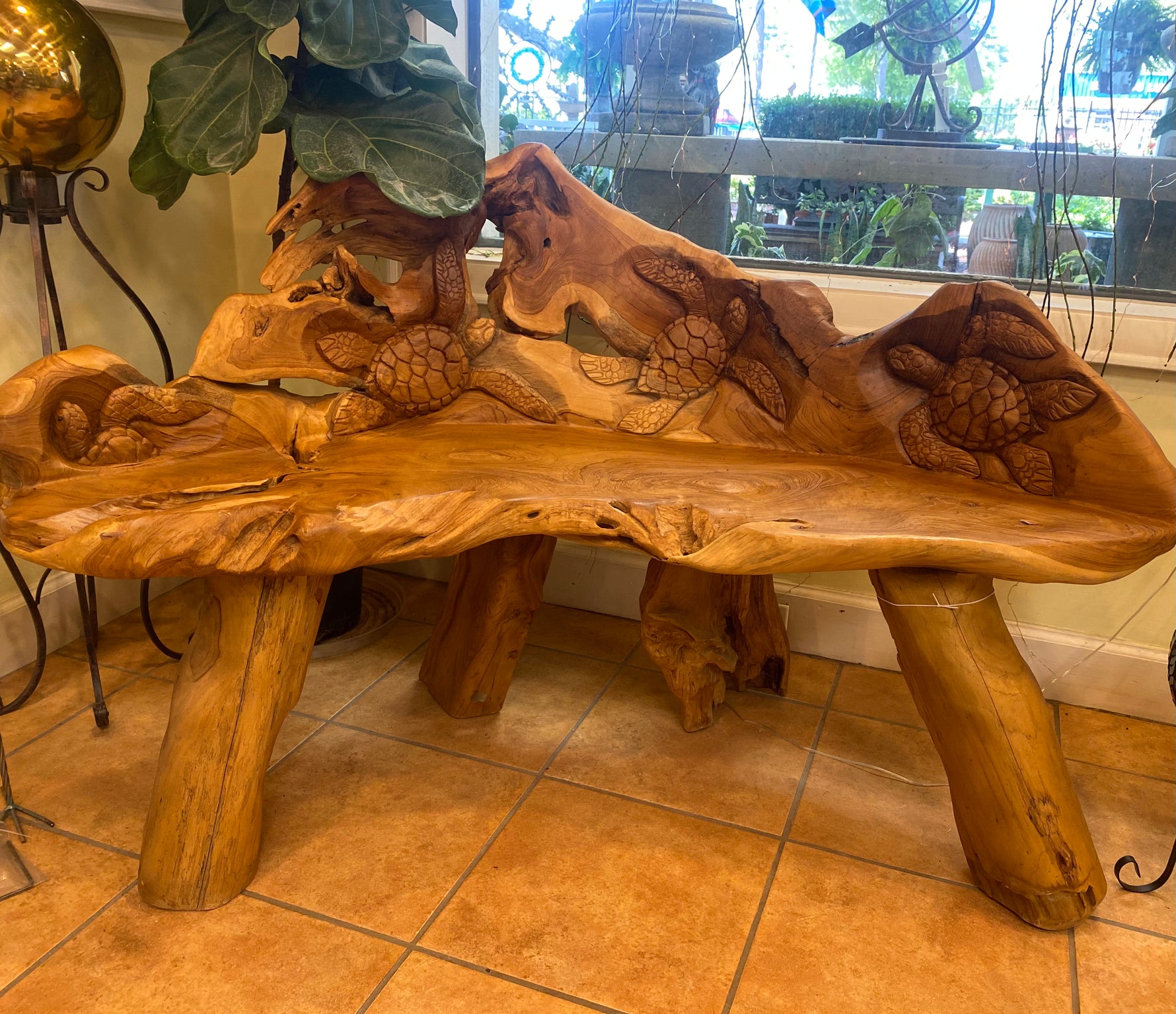 Handcrafted from solid teak wood, this extraordinary bench features beautifully carved sea turtles swimming across the natural curves and grains of the wood. Each bench is a one-of-a-kind piece that showcases the natural beauty and strength of teak, ideal for coastal decor, garden spaces, or sunrooms. A stunning functional sculpture that brings the spirit of the ocean to any setting.