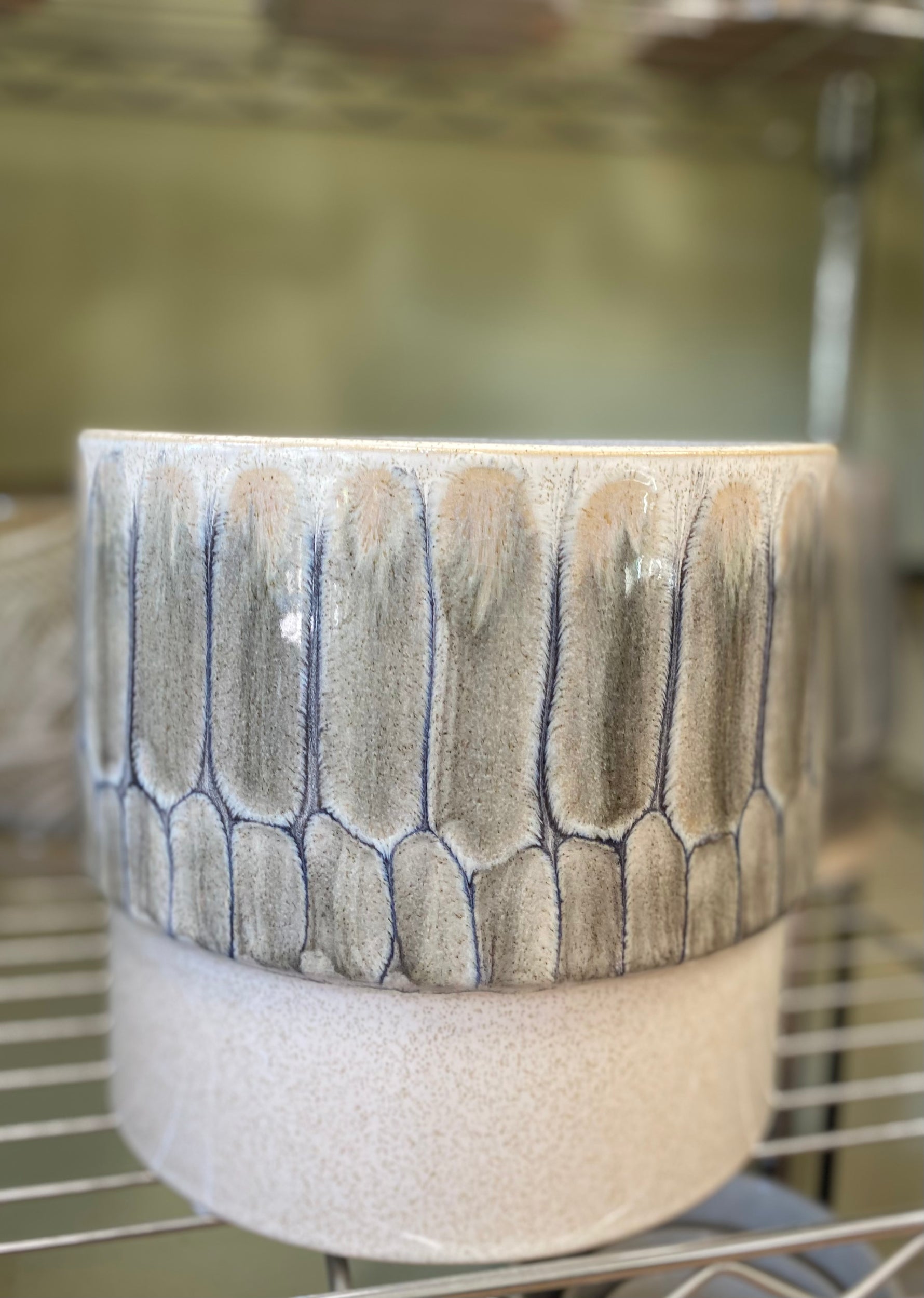 Elevate your greenery with the sophisticated style of this textured ceramic planter. Featuring a raised, stone-inspired pattern in soft gray and blue hues, it offers a natural, earthy feel with a modern twist. The matte-speckled lower half adds contrast and visual interest, making this planter an elegant focal point for any indoor space. Durable and refined, it's ideal for succulents, leafy plants, or decorative arrangements.