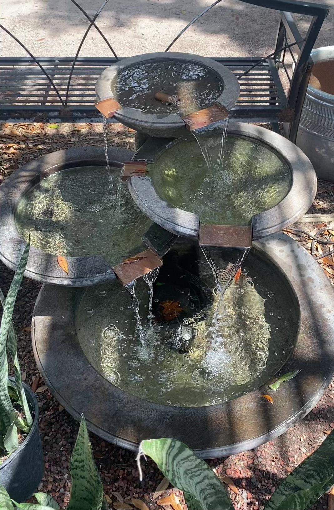 This stunning fountain offers a modern take on serenity with three tiered bowls flowing into one another in a gentle cascade. The copper spots add a warm contrast to the slate-gray finish, creating a beautiful blend of natural elements. The soft, continuous sound of water makes it a perfect focal point for patios, gardens, or mediation spaces. Crafted for both elegance and durability, it's a piece that brings calm and sophistication wherever it's placed.