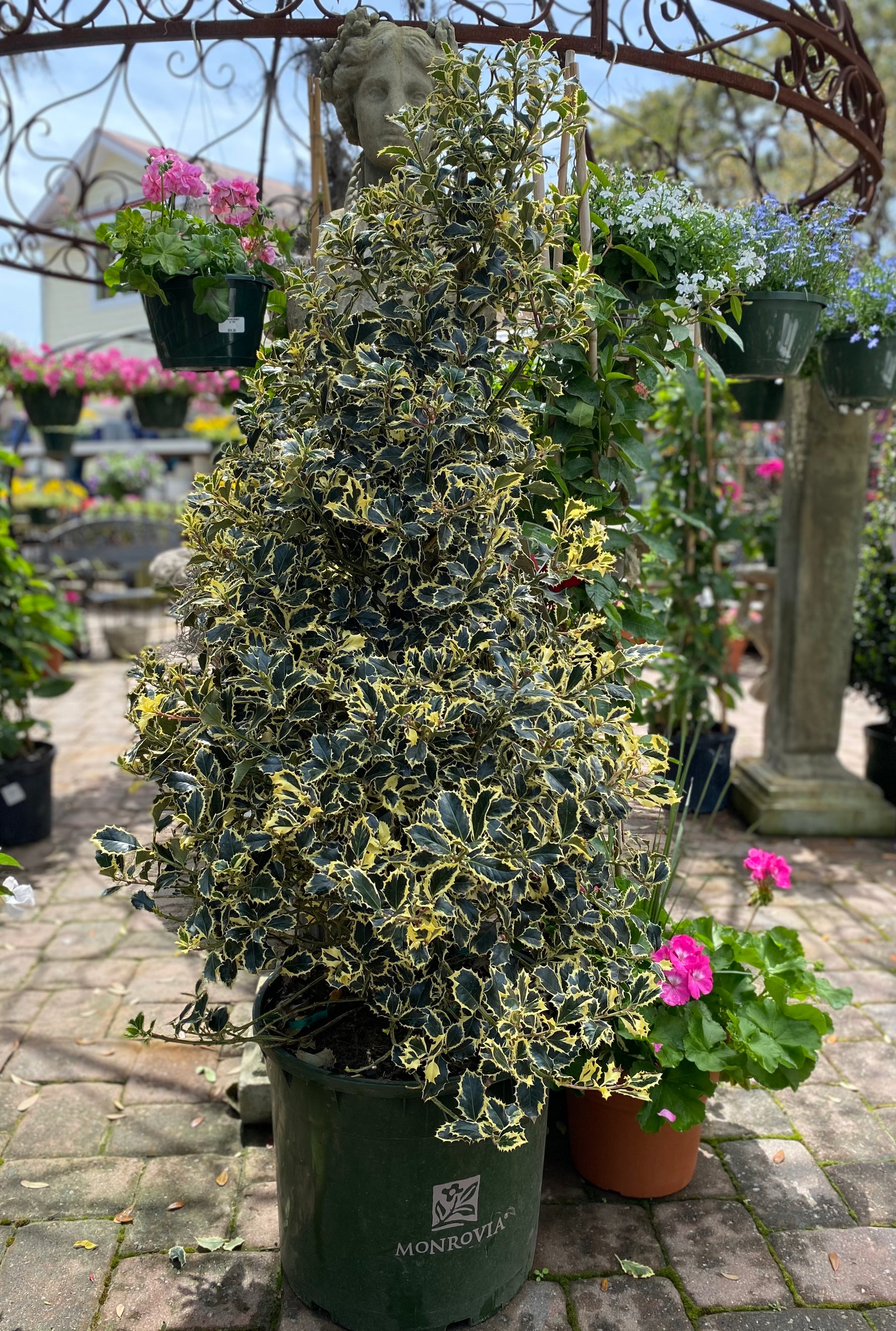 Variegated English Holly is a classic evergreen shrub prized for its striking green leaves edged in creamy white and its showy red berries in winter. With its sharp, glossy foliage and dense, upright habit, this holly offers year round interest and makes an elegant hedge, privacy screen, or holiday accent.