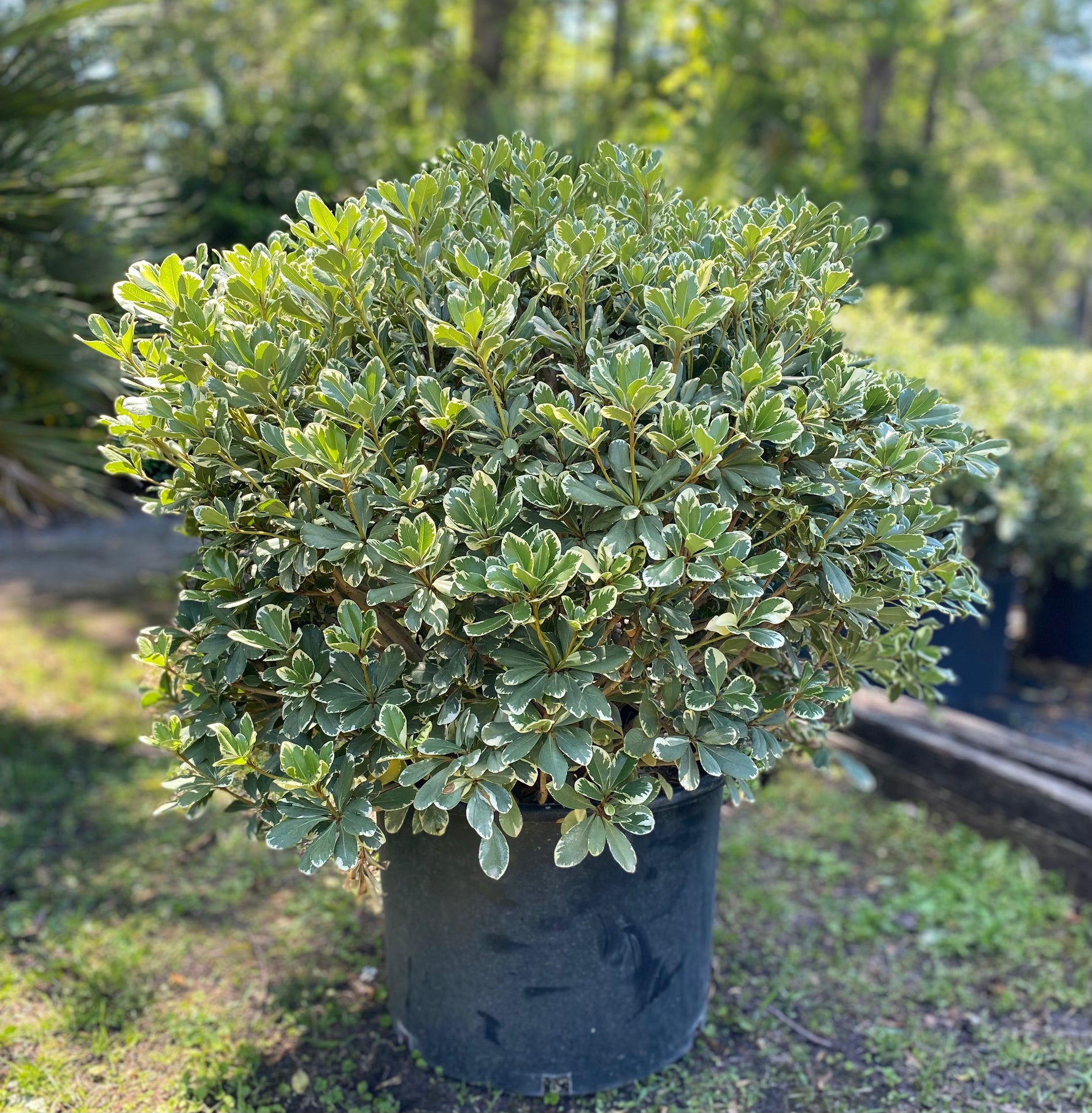 Variegated Pittosporum is a dense, evergreen shrub prized for its cream-edged green foliage and naturally rounded form. Its soft, leathery leaves create year-round texture and color contrast, while clusters of small, fragrant white flowers bloom in spring with a sweet-orange-blossom scent.