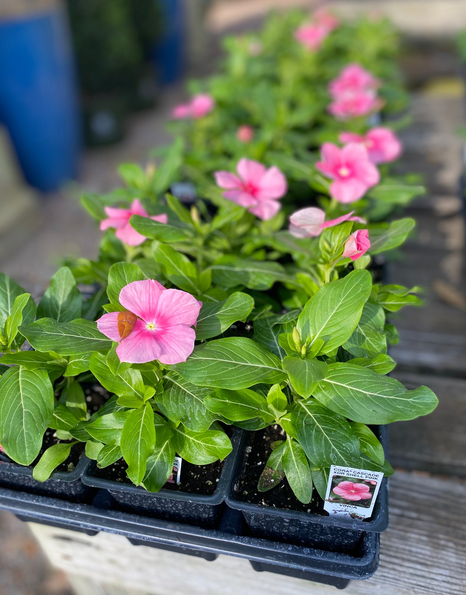 This is a trailing, disease-resistant variety that produces soft shell pink blooms with delicate centers. This vigorous annual thrives in full sun and hot, humid conditions, making it ideal for summer landscapes and containers. Its cascading habit makes it perfect for hanging baskets, window boxes, and ground cover use, spreading beautifully without becoming leggy. The "XDR" in its name stands for Extra Disease Resistant, meaning it's highly resistant to phytophthora and other common vinca diseases. It blooms continuously from late spring through fall with minimal care.