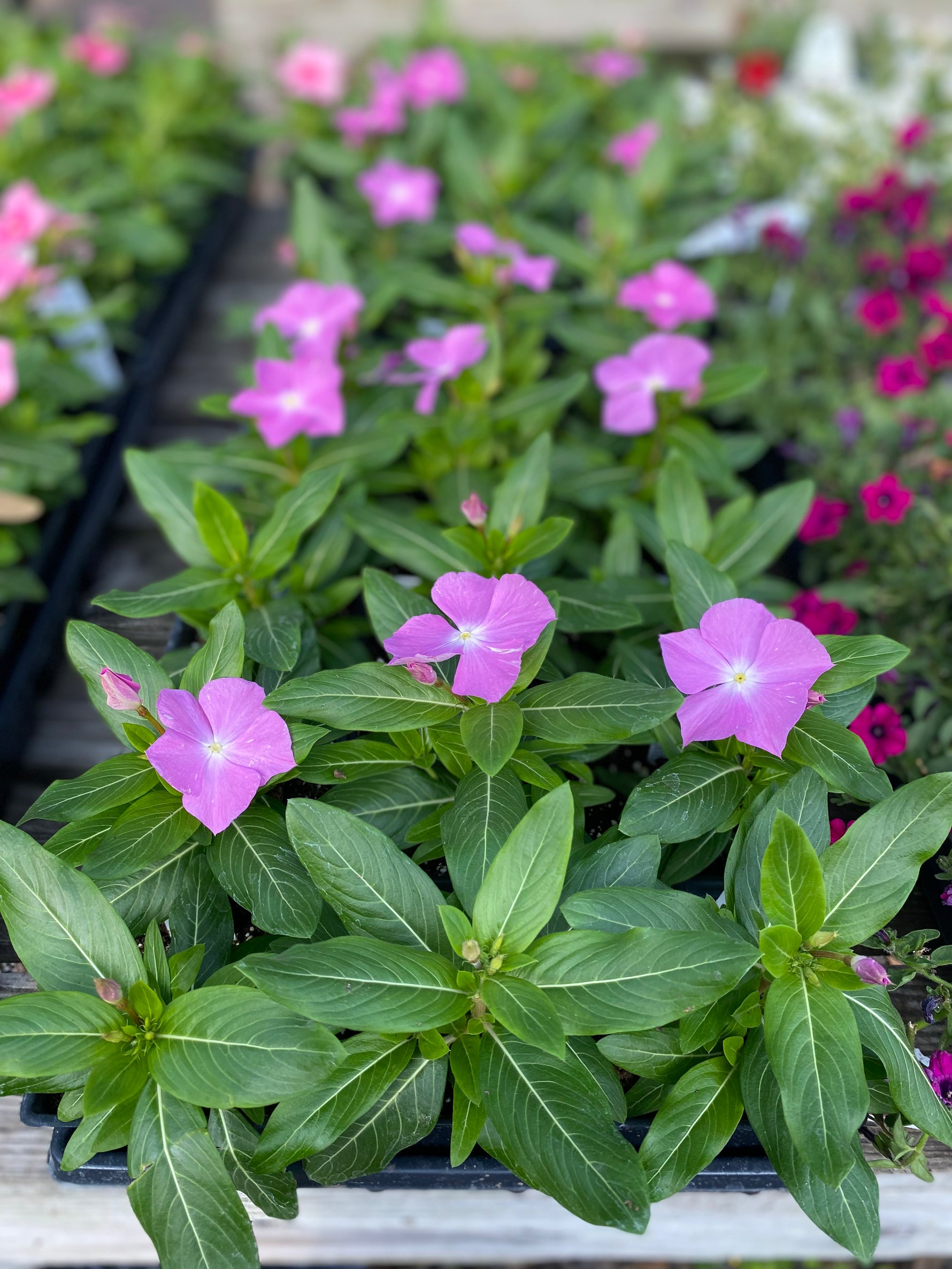 Lavender Vinca, also known as Madagascar Periwinkle, is a heat loving, low maintenance annual that brings continuous color to sunny garden beds and containers. Its glossy green foliage contrasts beautifully with soft lavender blooms that resemble impatiens but thrive in full sun and dry conditions. This drought - tolerant flower blooms from spring to frost without deadheading, making it an ideal choice for landscapes needing reliable, fuss-free color. Vinca is also resistant to deer and pests, perfect for borders, mass plantings, or patio pots.