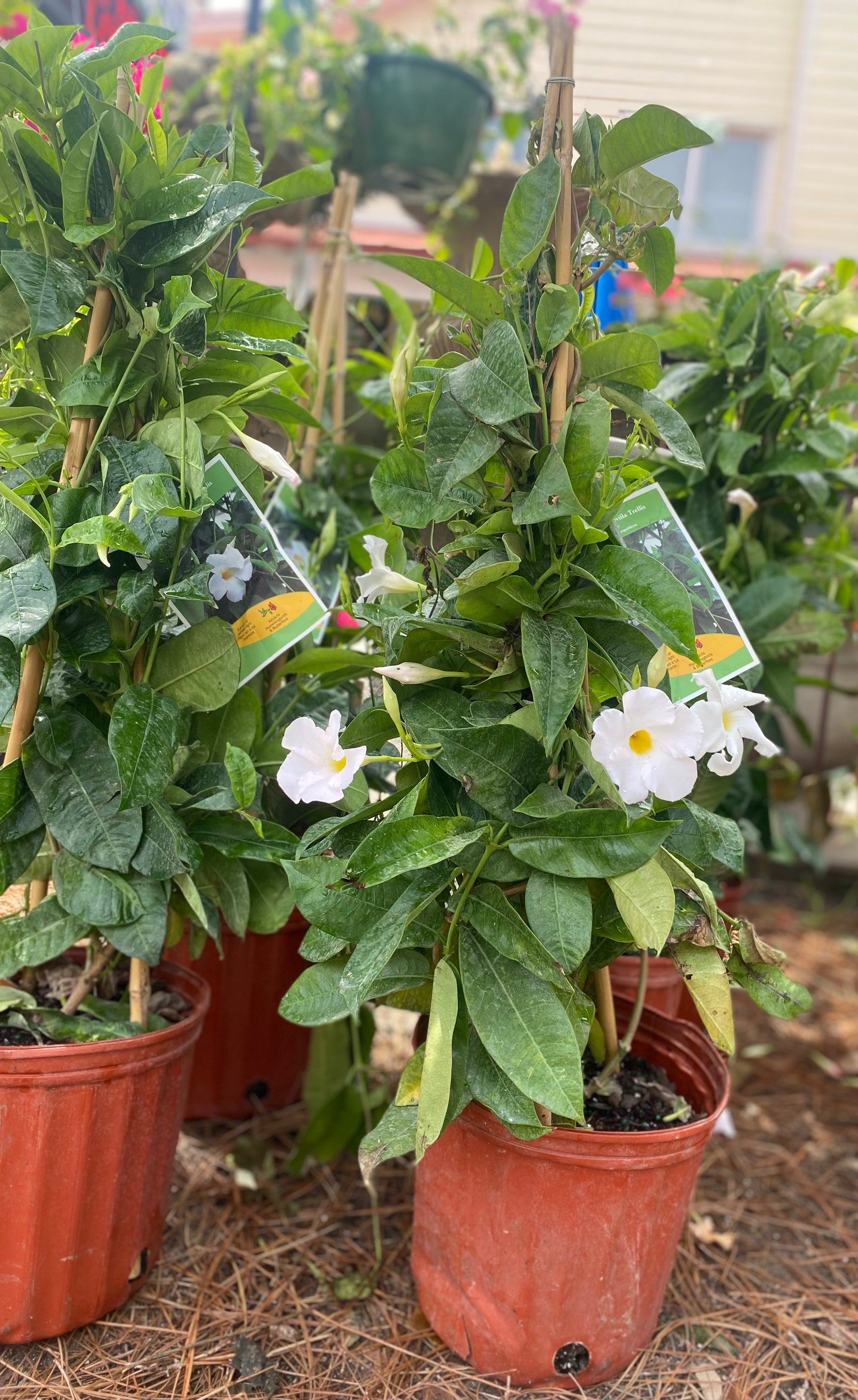 White Mandevilla trained on a trellis for effortless vertical beauty. This fast-growing vine produces stunning, trumpet shaped white flowers with a soft yellow center, blooming continuously from late spring through fall. Its glossy green foliage and elegant blooms make it perfect for entryways, balconies, or bright garden corners.