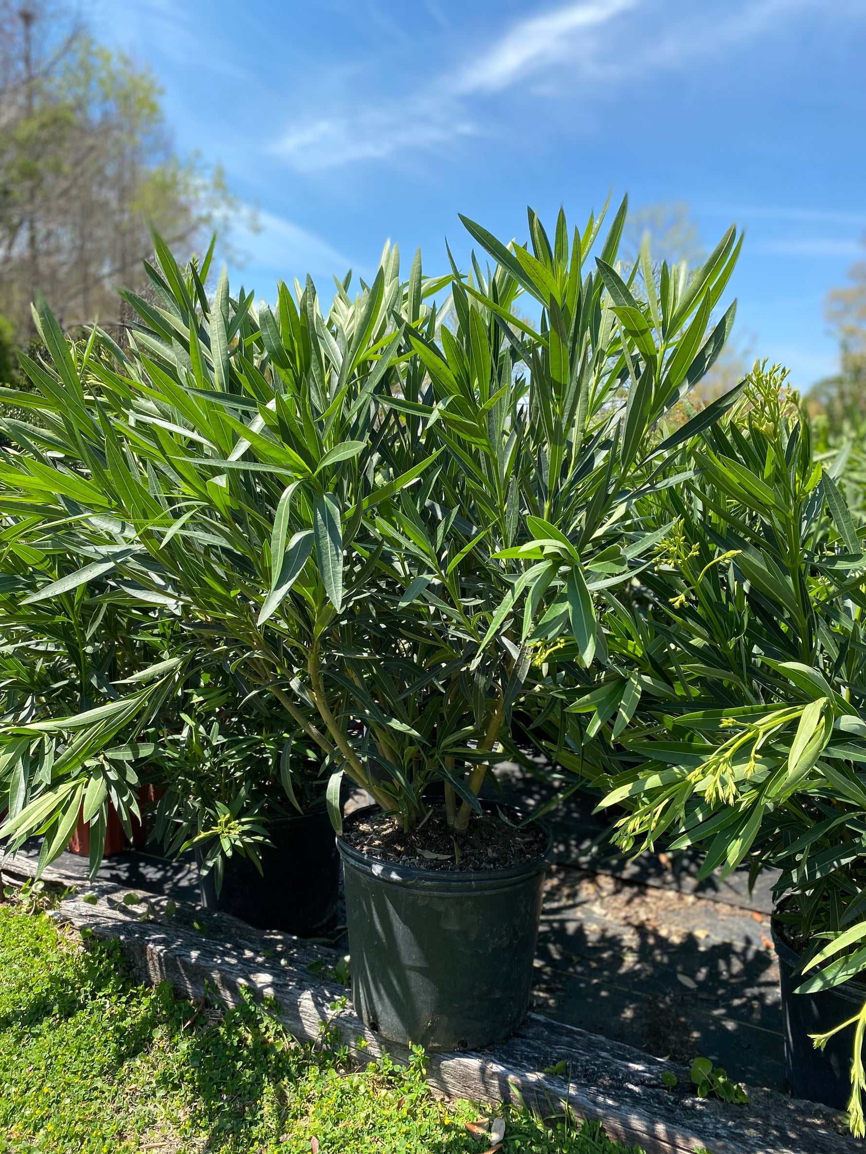 Oleander is a fast growing evergreen shrub or small tree known for its lush green foliage and clusters of pure white, fragrant flowers that bloom from spring through fall. This sun loving beauty brings a clean, tropical feel to yards, hedges, and containers.
