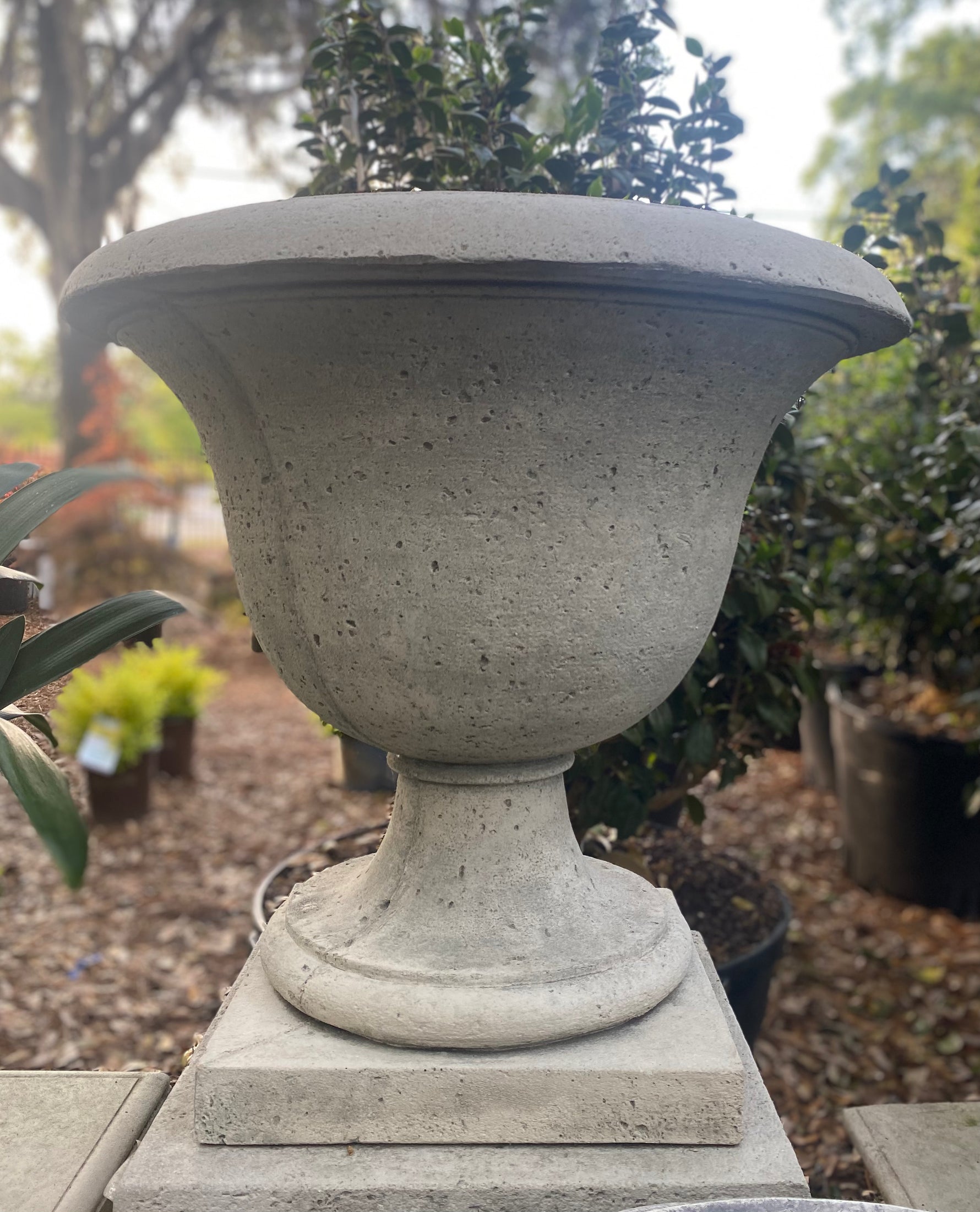 This grand cast stone planter features a timeless, classical silhouette with a deep bowl and broad flared rim, offering both elegance and durability for any outdoor setting. Crafted from heavy-duty cast stone ensures exceptional stability and resistance to the elements. Ideal for anchoring formal garden entrances, patios, or walkways, this substantial piece pairs beautifully with seasonal arrangements, evergreens, or flowering shrubs for a stately, sophisticated display.