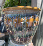 This striking glazed ceramic planter features a high-gloss finish in deep earthy tones of amber, jade, and charcoal, reminiscent of a glowing sunset. Delicate raised vine and petal motifs encircle the upper rim, adding texture and elegance. Its durable construction and artistic glaze make it a perfect centerpiece for patio displays, entryways, or garden accents. Ideal for showcasing flowering plants or ornamental grasses.