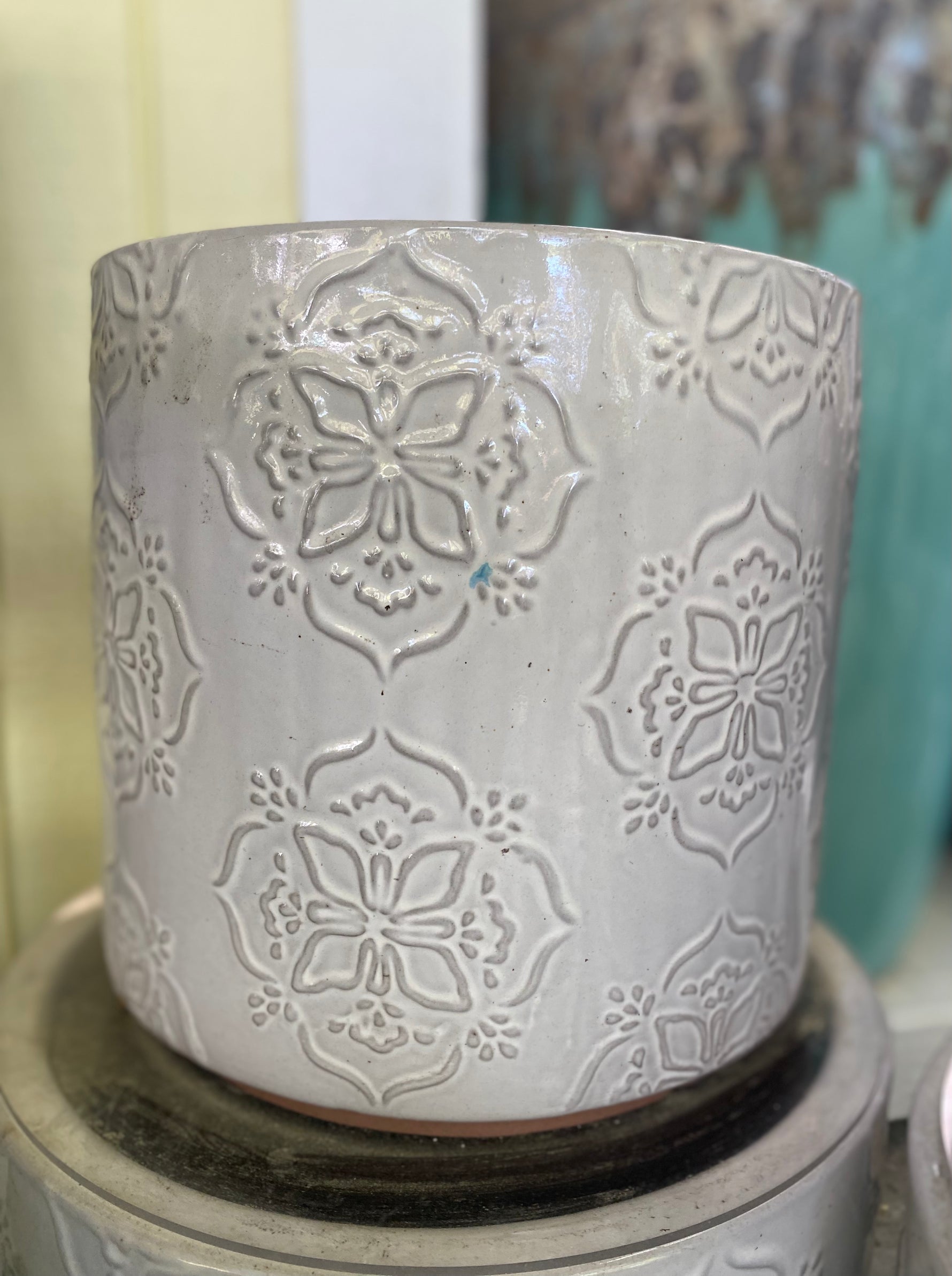 Elevate your indoor or outdoor greenery with this elegant white planter, featuring a delicate embossed floral medallion pattern. Its glossy finish an intricate texture add a touch of sophistication to any space. Perfect for showcasing your favorite houseplants, herbs, or seasonal blooms. A timeless piece that complements both traditional and modern decor.